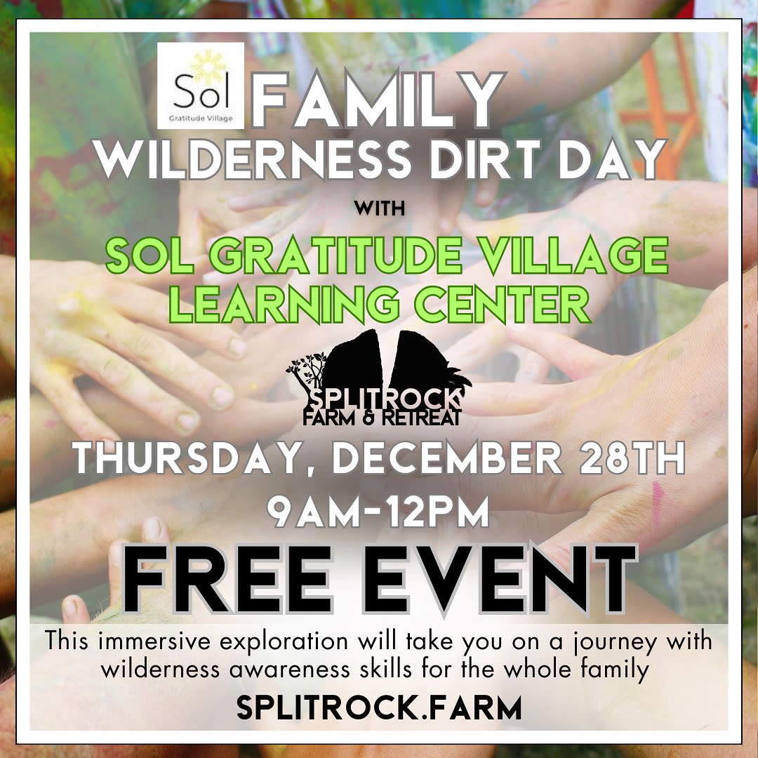 Join us for a Wilderness Dirt Day! We will take you to an exploration journey of some wilderness awareness skills for the whole family. This incredible 3 hour workshop is for children and families to participate in the first of many offerings from Sol Gratitude Village learning center at Splitrock Farm & Retreat. It takes a village and we are building an educational community.
