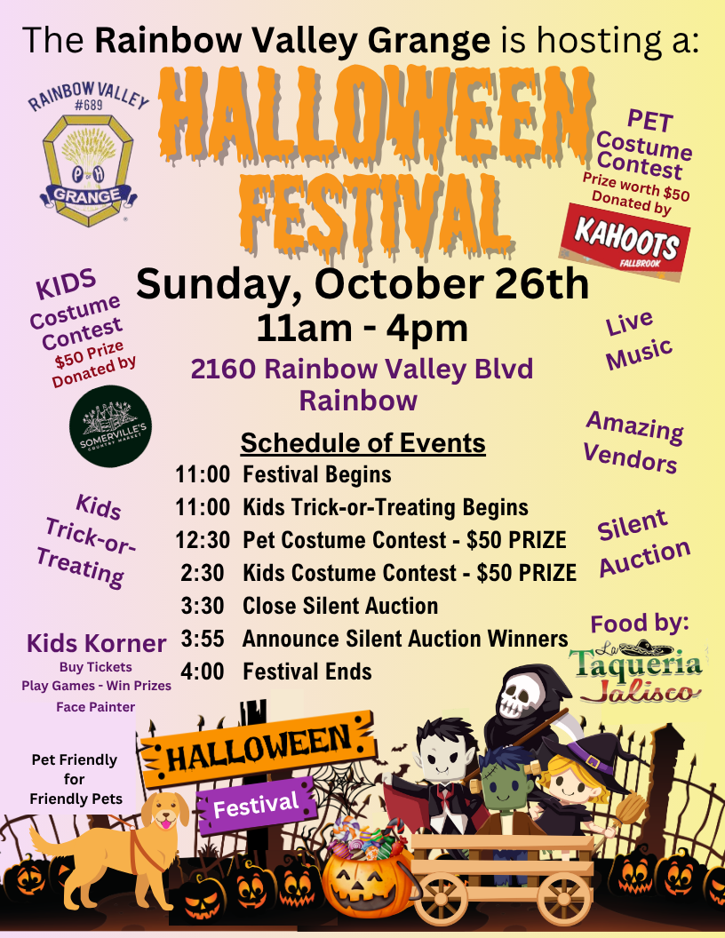 Embrace the exciting spirit of Halloween at our fun-filled Festival. With a delightful mix of local vendors and unique finds, this event promises a perfect blend of shopping, community, Halloween fun, Costume Contests, Trick-or-Treating and joy under the blue skies of Rainbow Valley. 🌈