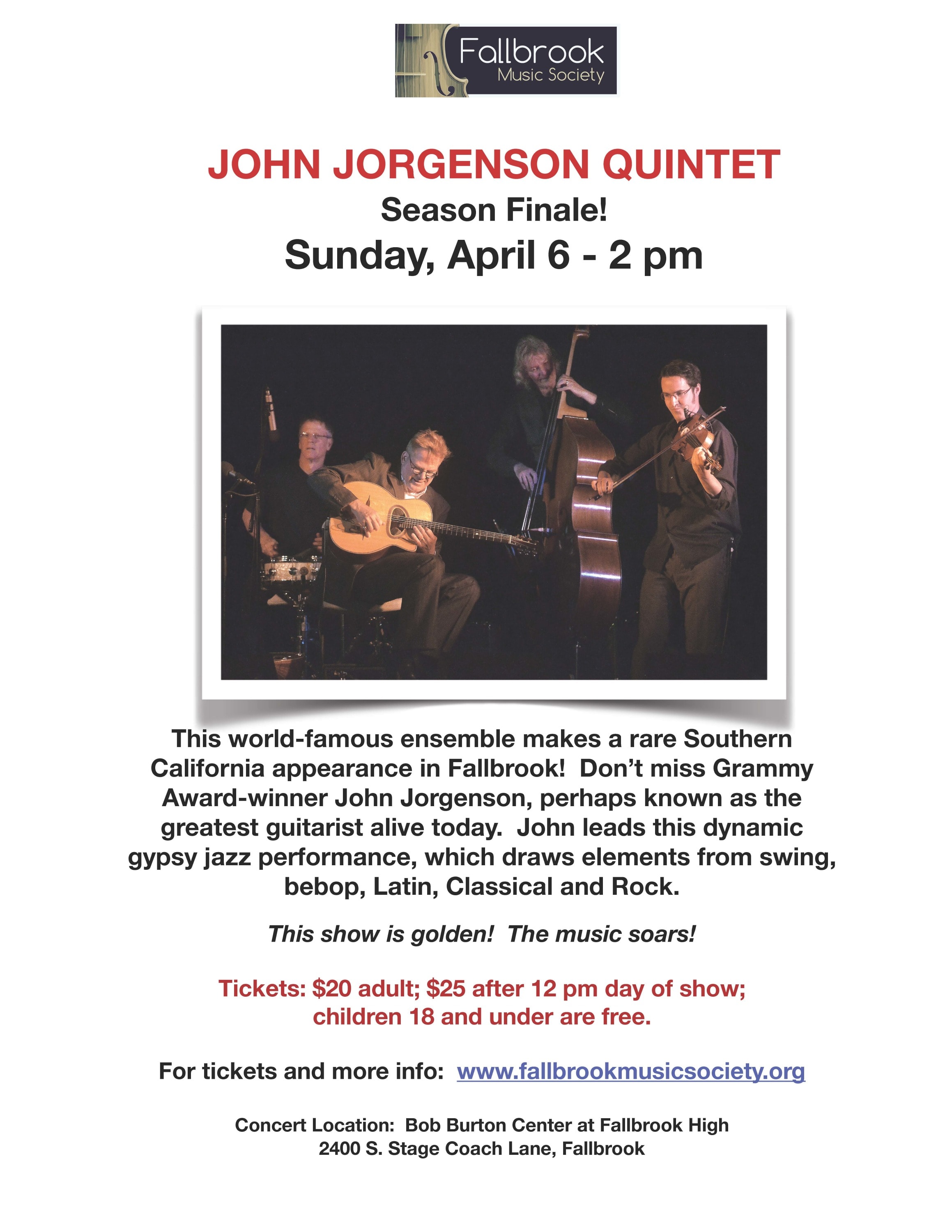 Award-winning guitar virtuoso John Jorgenson, known for his exquisite guitar techniques and world-class musicianship, leads his instrumental gypsy jazz quintet in this not-to-be missed concert. Making a rare stop in So. California, the renowned ensemble performs the unique swing style sounds of the melodic music of Django Reinhardt in a mix of soulful romance and rollicking celebration. John Jorgenson, possibly one of the best jazz guitarists alive, is known for his mastery of a broad musical palette and is leaving a lasting legacy in the art of guitar performance. The group’s style has been called gypsy jazz after the dynamic string-driven swing created in 1930’s Paris – but their compositions draw in elements of Latin, Romanian, Classical, Rock and Greek music, so perhaps a more apt description is “21st Century World Music.”