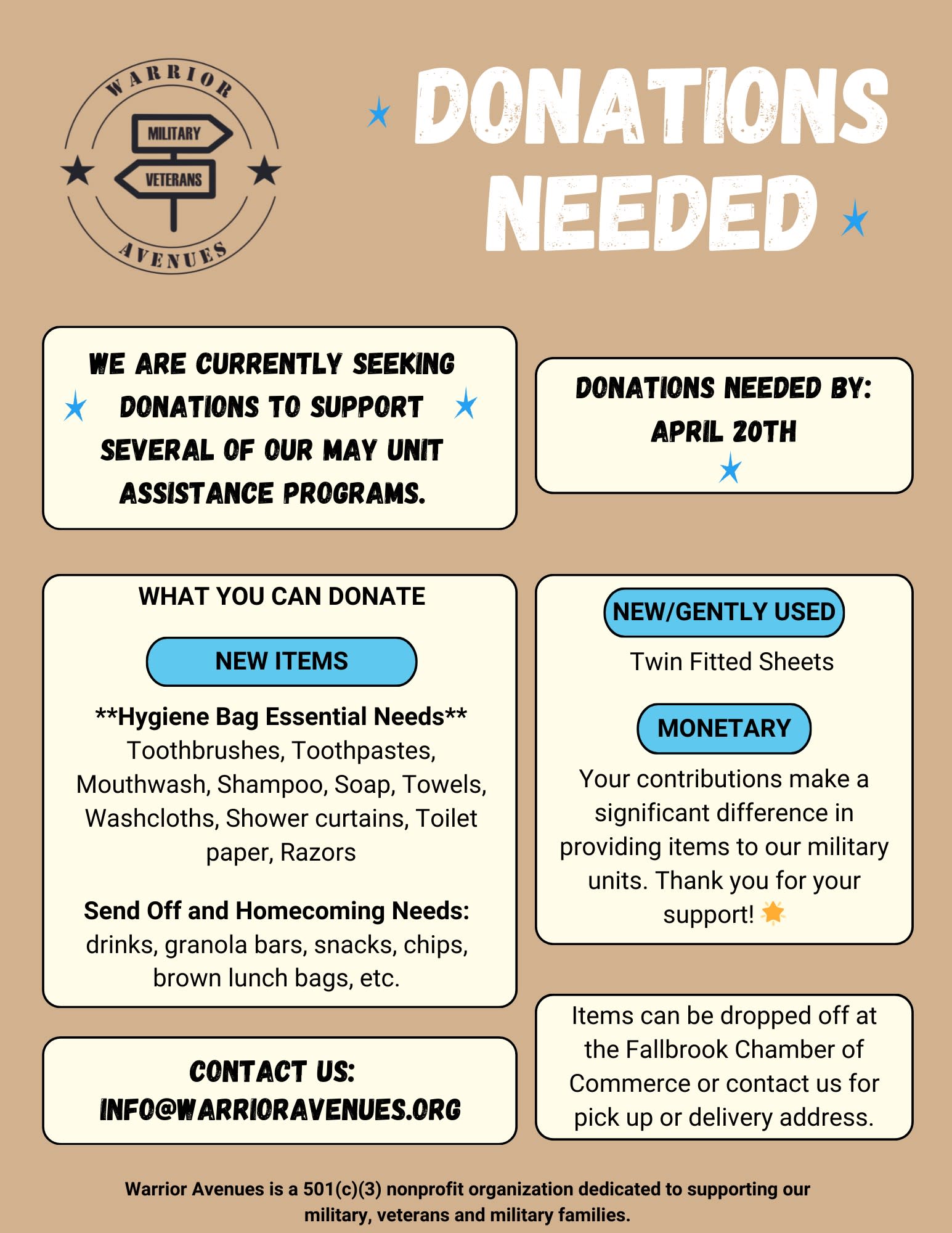 Items can be dropped off at the Fallbrook Chamber of Commerce or contact Warrior Avenues for pick up or delivery address.