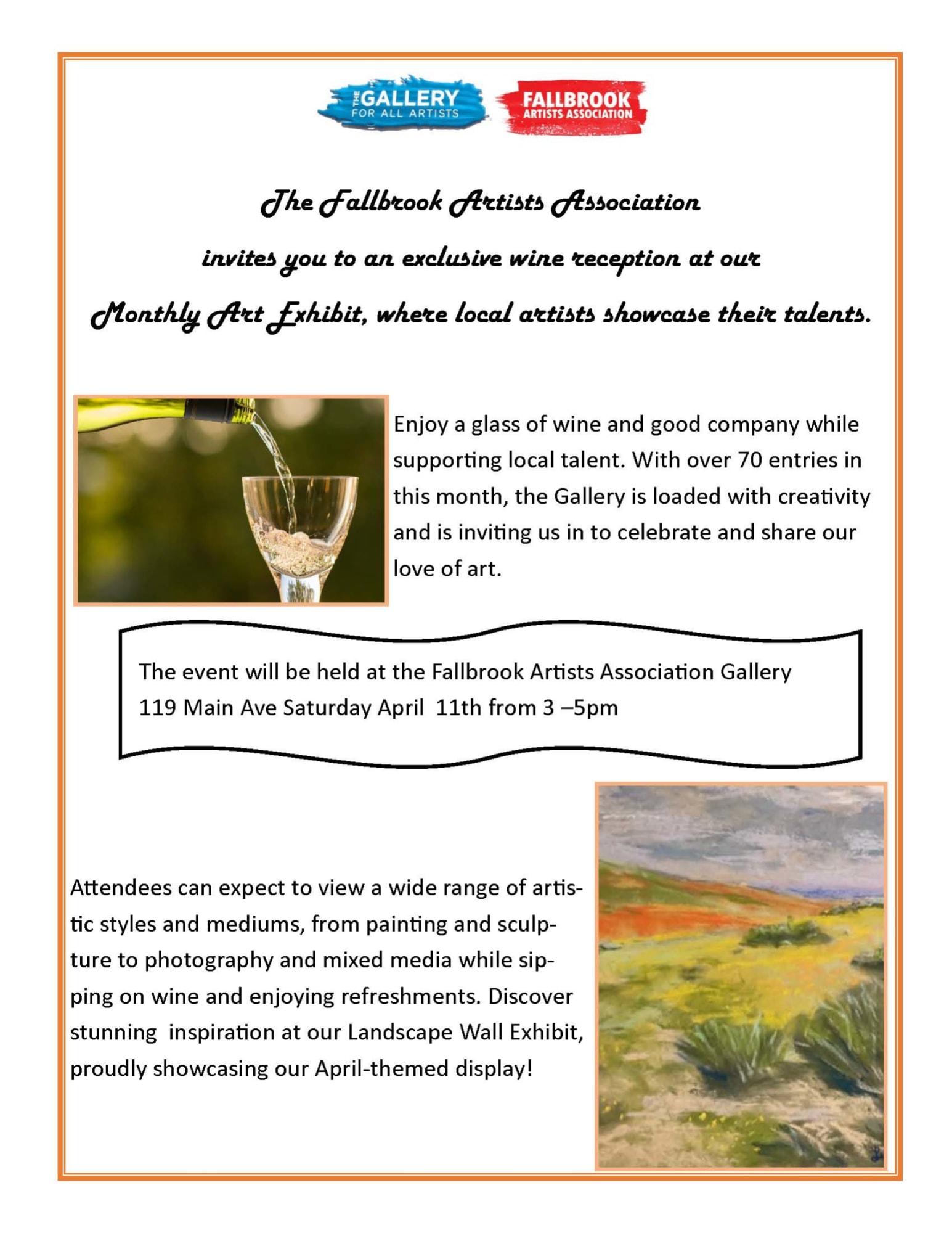 URL:https://business.fallbrookchamberofcommerce.org/communityevents/Details/fallbrook-artists-association-april-art-and-wine-reception-1700256?sourceTypeId=Hub