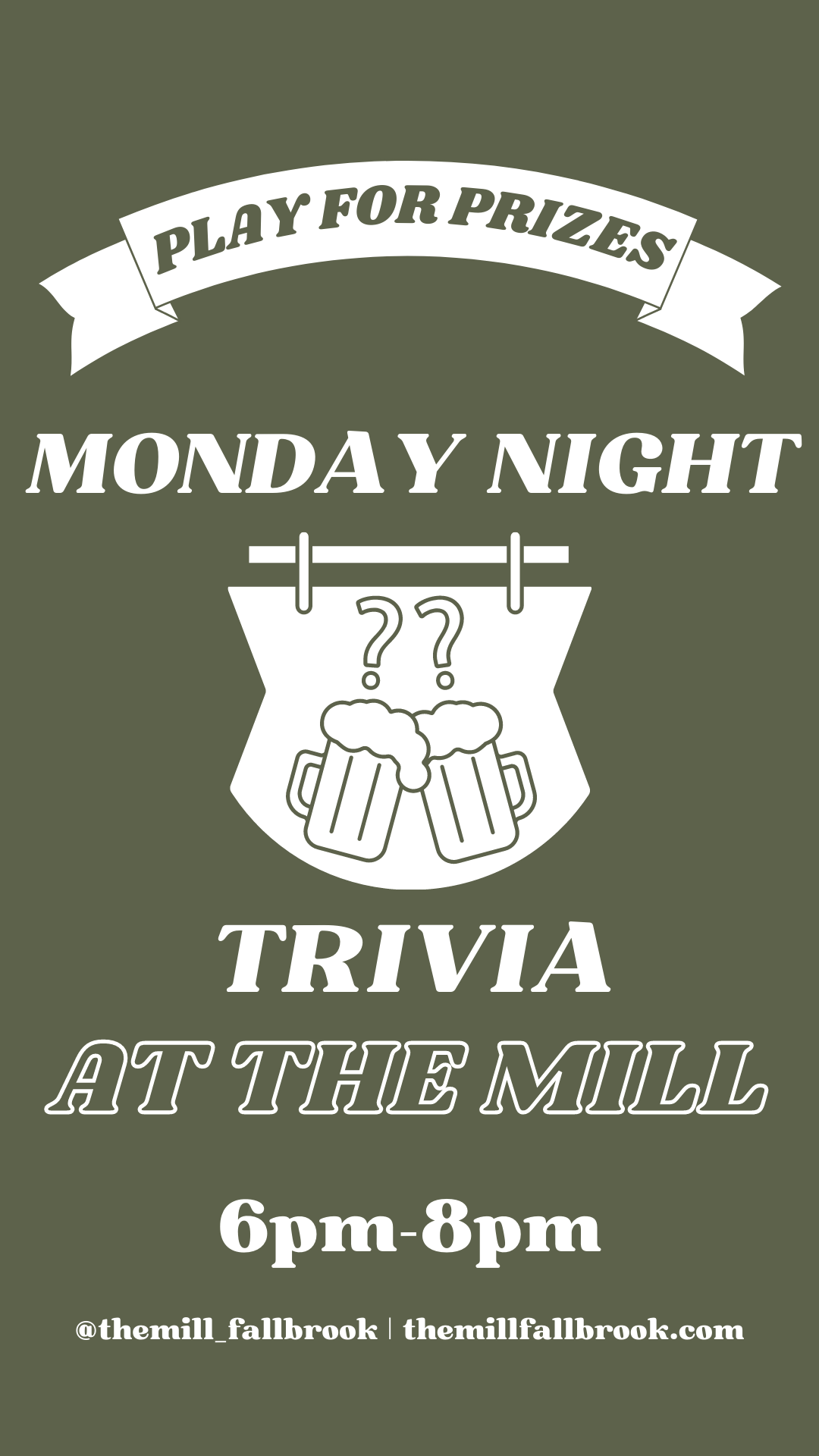 URL:https://business.fallbrookchamberofcommerce.org/communityevents/Details/monday-night-trivia-at-the-mill-920303?sourceTypeId=Hub