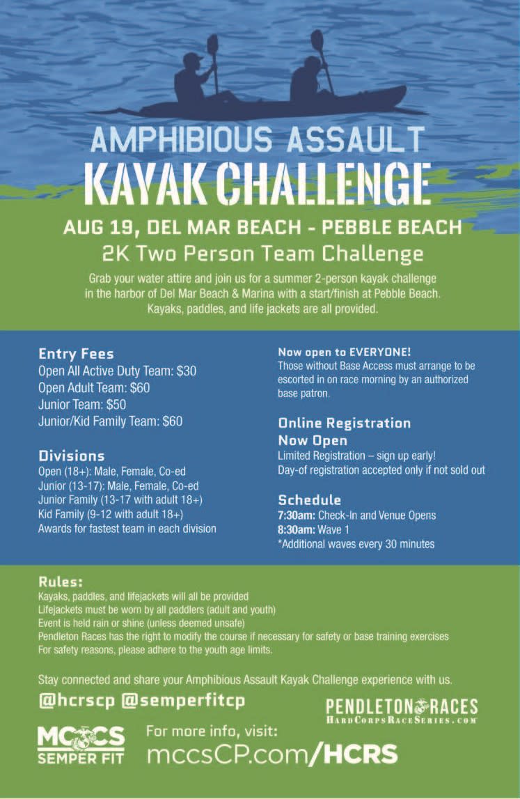 Grab your water attire and join us for a summer 2-person kayak challenge in the harbor of Del Mar Beach & Marina with a start/finish at Pebble Beach. Kayaks, paddles, and life jackets are all provided.