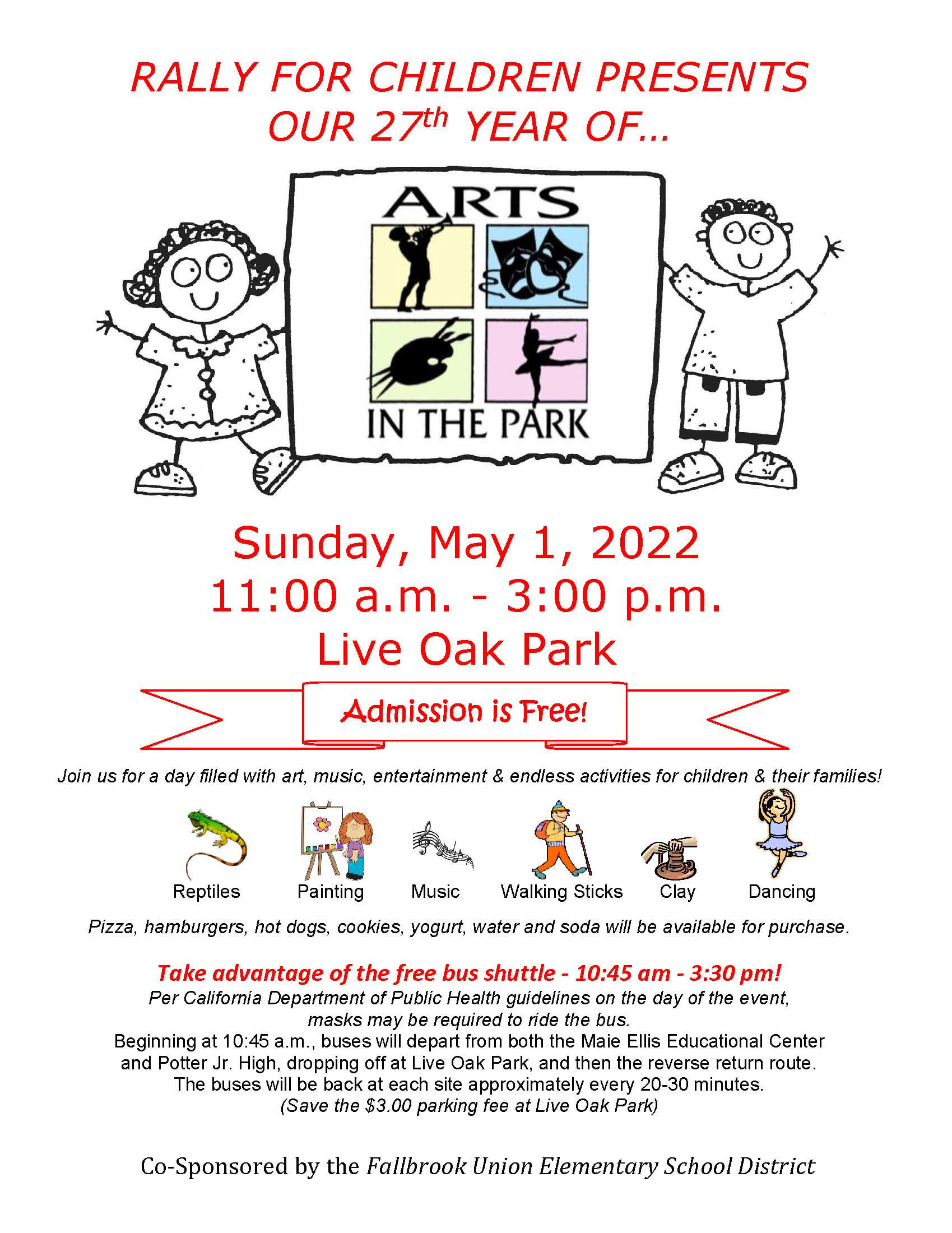 Arts in the Park- Rally for Children Back to Search Arts in the Park- Rally for Children Sunday, May 1, 2022 (11:00 AM - 3:00 PM) (PDT) Description Additional Info × Live Oak Park 2746 Reche Rd. Fallbrook, CA 92028 Sunday, May 1, 2022 (11:00 AM - 3:00 PM) (PDT) Registered Guests × Share × Print Email Add to Calendar Facebook LinkedIn X Pinterest Powered By GrowthZone