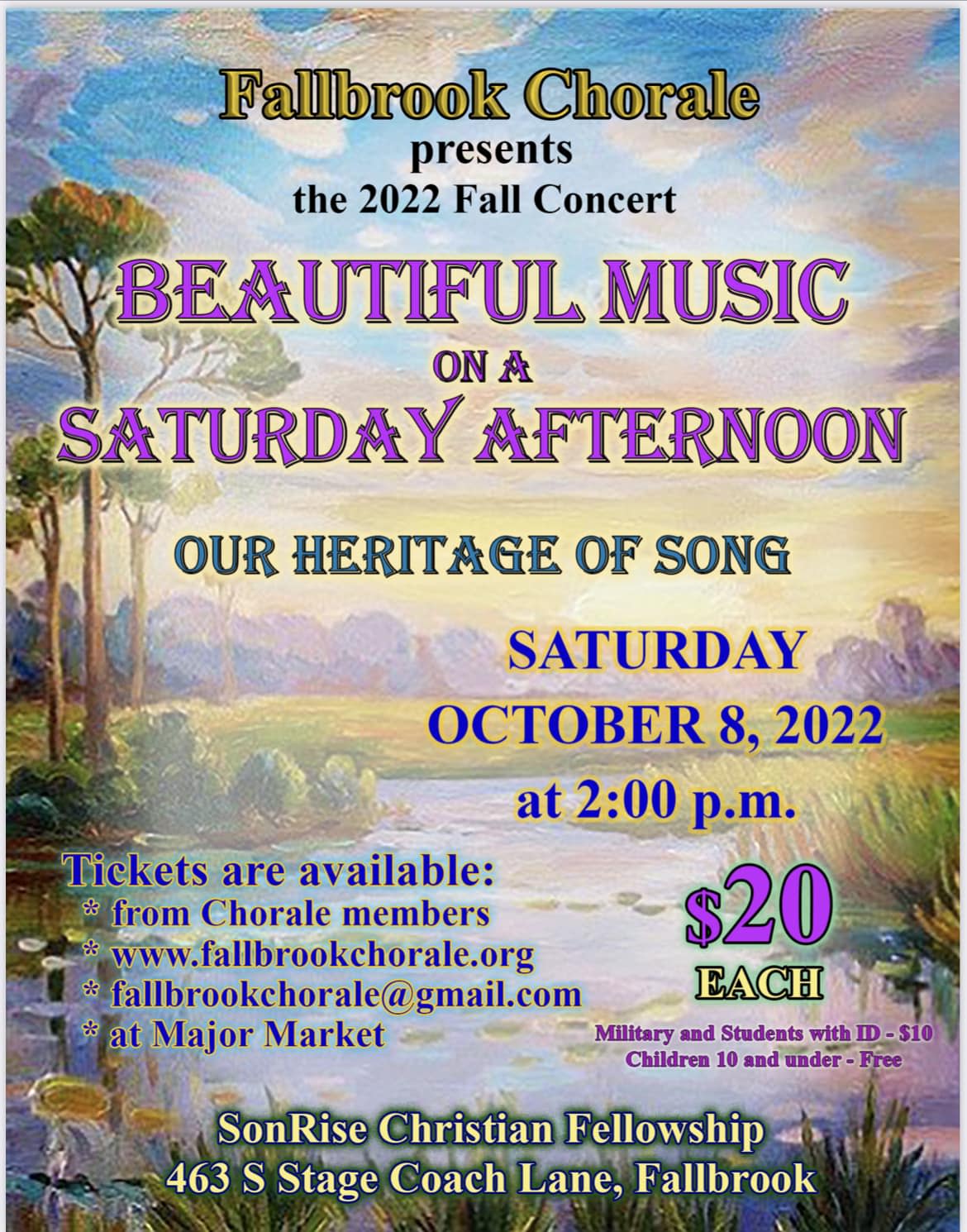 The Fallbrook Chorale is Fallbrook’s own volunteer singing group! We’re always looking for new singers to come join us. Please contact us at fallbrookchorale@gmail.com for additional information. Our Spring Concert originally scheduled for Saturday June 25, 2022, has been RESCHEDULED to Saturday October 8th at 2pm! If you purchased a ticket already for our Spring Concert that was cancelled, we will either honor your Spring ticket on the NEW DATE or at our Christmas Concert on 12/10/22. Please send an email to fallbrookchorale@gmail.com, provide your ticket numbers, and let us know if you are able to attend on 10/8/22 or if you would prefer to redeem your ticket on 12/10/22. Tickets are $20 each, $10 for Military and Students with ID, and FREE for children 10 and under. If you would like to purchase a ticket, you may do so from any Chorale member, at Major Market or HERE (general tickets only):