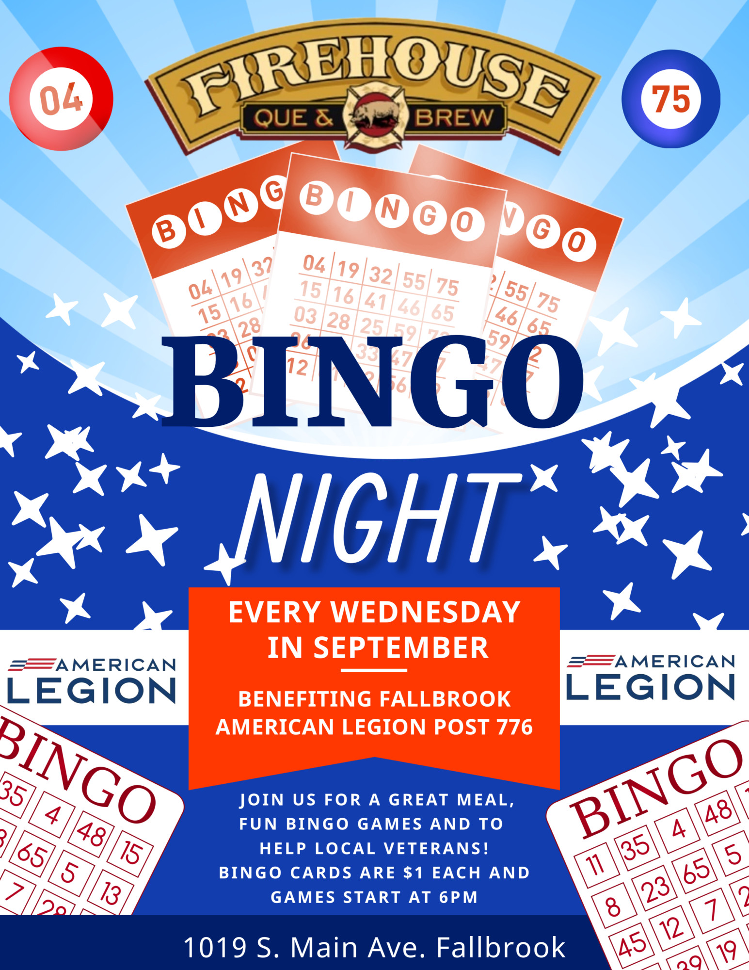 Bingo Night Fundraiser at Firehouse Que and Brew for Fallbrook American Legion Post 776