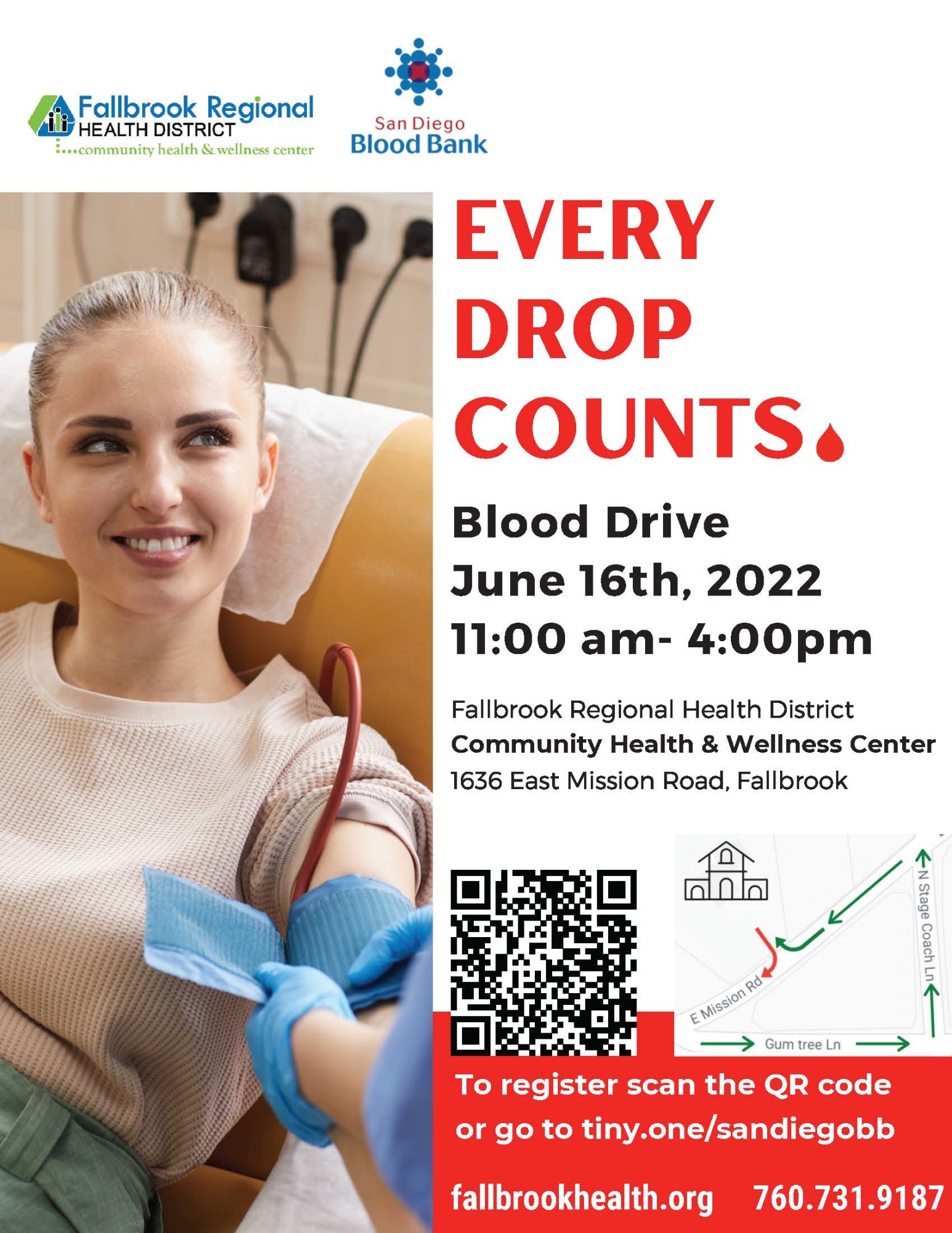 Blood Drive Back to Search Blood Drive Thursday, June 16, 2022 (11:00 AM - 4:00 PM) (PDT) Description Additional Info × Community Health & Wellness Center 1636 E. Mission Rd. Fallbrook, CA 92028 United States Thursday, June 16, 2022 (11:00 AM - 4:00 PM) (PDT) Registered Guests × Share × Print Email Add to Calendar Facebook LinkedIn X Pinterest Powered By GrowthZone