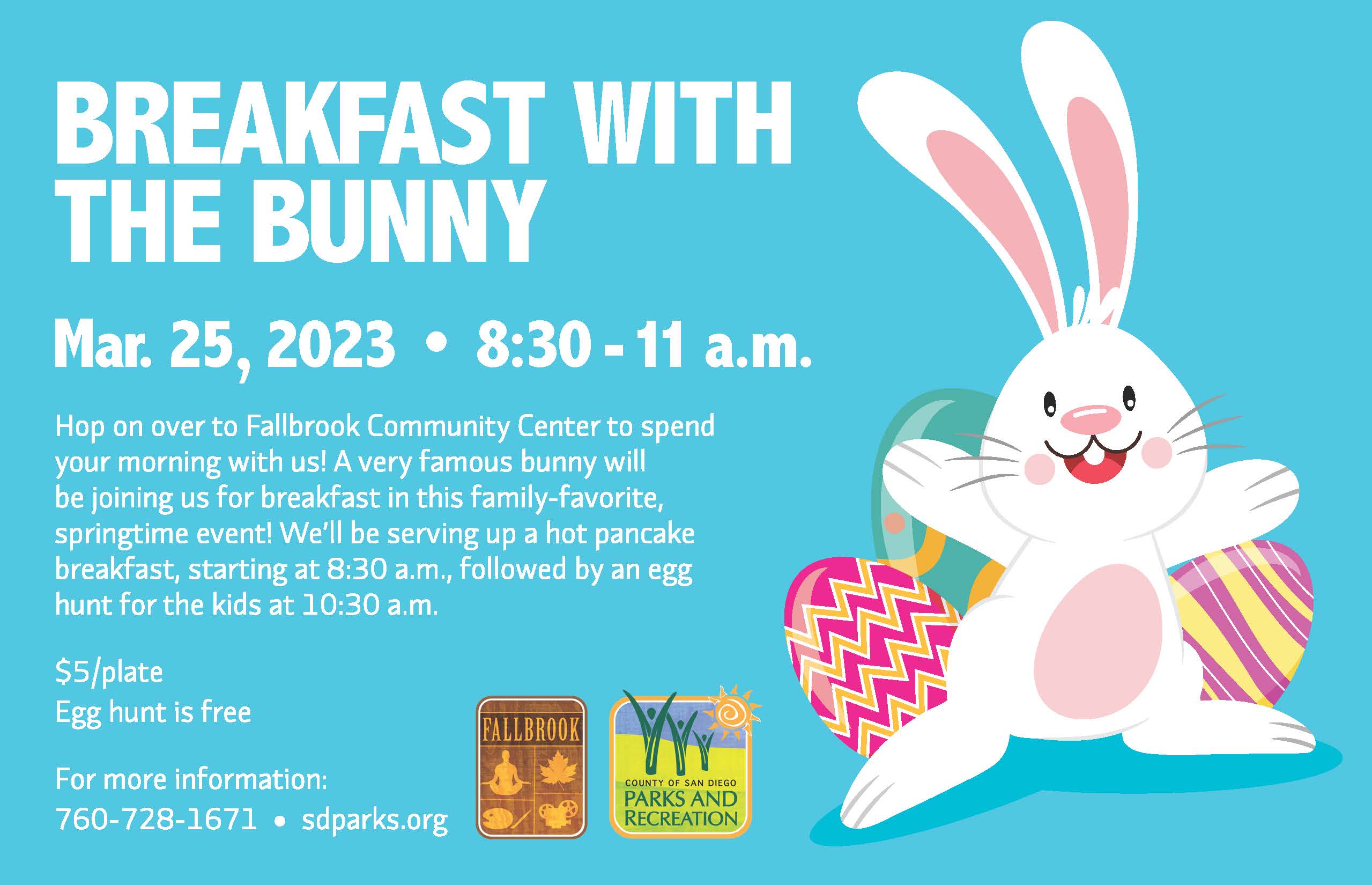 Hop on over to the Fallbrook Community Center to spend your morning with us! A very famous bunny will be joining us for breakfast in this family-favorite, springtime event! We'll be serving up a hot pancake breakfast, starting at 8:30 a.m., followed by an egg hunt for the kids at 10:30 a.m.