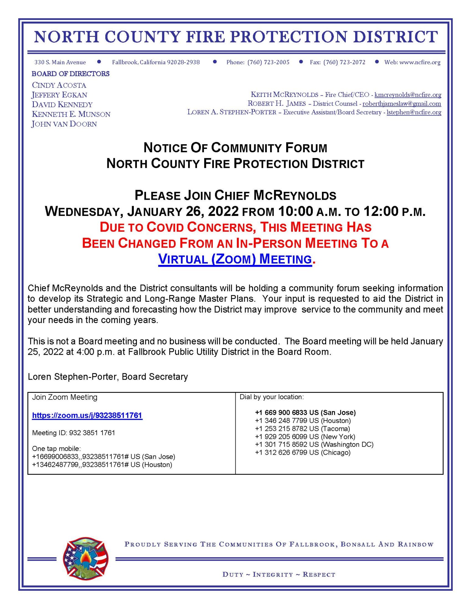 North County Fire is having a community forum, soliciting feedback from community members in order to develop its Strategic and Long Term Plans. You are invited to attend a VIRTUAL meeting on January 26, 2022, as detailed in the attached flyer.