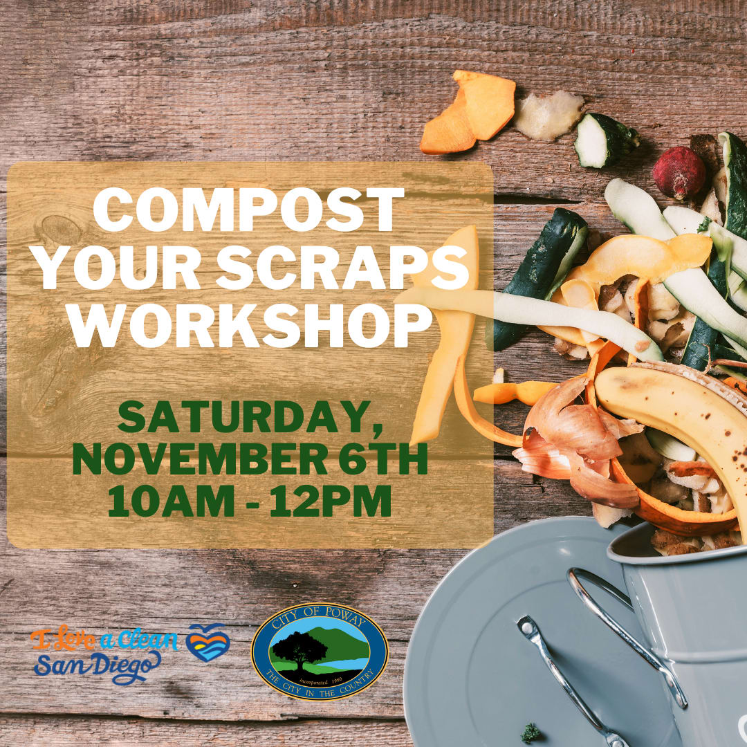 You’ve started meal planning, cooking with scraps, and storing all of your groceries properly. You’ve even attended one of our Save Your Scraps webinars – but you’re still faced with inedible food waste! What can we do with the scraps of food that we don’t eat? Learn about composting these scraps and take home your very own vermicomposting bin at our Compost Your Scraps Workshop! Join I Love A Clean San Diego for our first in-person workshop of the year, focused on kitchen waste reduction and composting. We’ll cover how to keep organics out of the landfill by shopping smart, storing food properly, and composting your scraps. We’ll also discuss different composting methods, do’s and don’ts for making healthy soil, and how to use your finished compost. The first 25 registrants will be able to create and take home a fully functioning vermicomposting bin (composting with worms)! Please indicate your interest in your registration and limit one vermicomposting bin per household. This Compost Your Scraps workshop will take place on Saturday, November 6th, from 10am to 12pm at Old Poway Park (14134 Midland Road, Poway, 92064). Our location does have a few picnic tables, but please bring a chair or picnic blanket if you would like to spread out. The farmer’s market will be occurring, so pick up some fresh produce on your way over! Registration will first open to Poway residents. Please confirm your residency by entering your full address when you select a ticket. Registration will open to the general public on October 12th. Due to supply restrictions and current health guidelines, we are limited to 40 total participants. If you register but are unable to attend, please email us at education@cleansd.org as soon as possible so we can give your space to another resident. Per CDC guidelines, masks are strongly encouraged for all attendees whether indoors or outdoors. ILACSD staff will be wearing masks at all ILACSD public events. If you are feeling sick or have come in contact with someone with COVID-19, please do not attend. Register here: https://cleansd.org/event/compost-your-scraps-workshop-11-6/