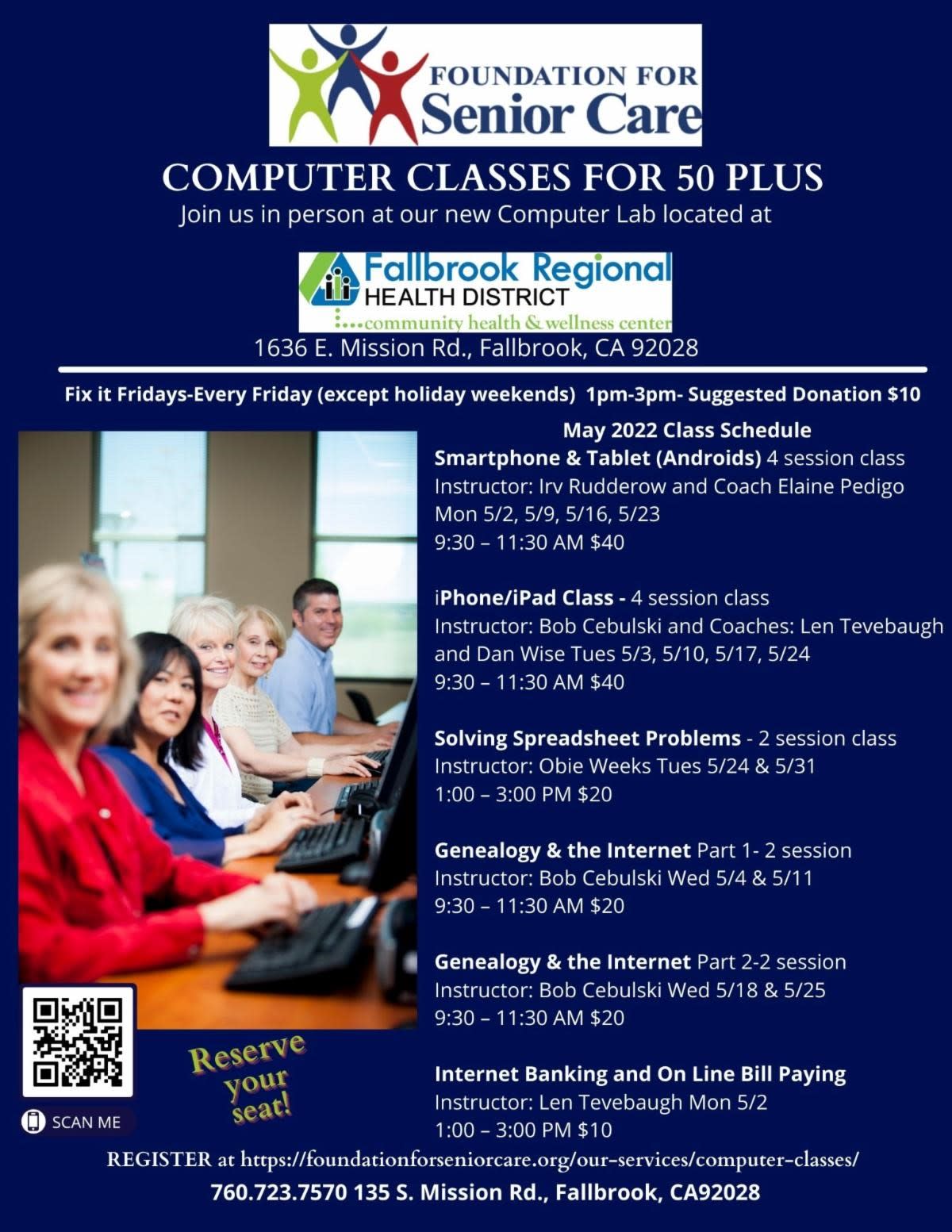 Computer Classes Anyone over 50 years old is welcome to come study some of the basics of using a computer, the Internet, and social media. We have a volunteer staff of world-class instructors who not only know their subject matter front to back, but are skilled in communicating with our clients. We keep the classes deliberately small; only eight people are allowed in each one, which ensures that everyone gets ample hands-on attention and care. Because of this, advanced signup is required to get into one of our classes! Current Classes are located at: The Fallbrook Regional Health District Community Health & Wellness Center 1636 E. Mission Blvd Fallbrook, Ca 92028