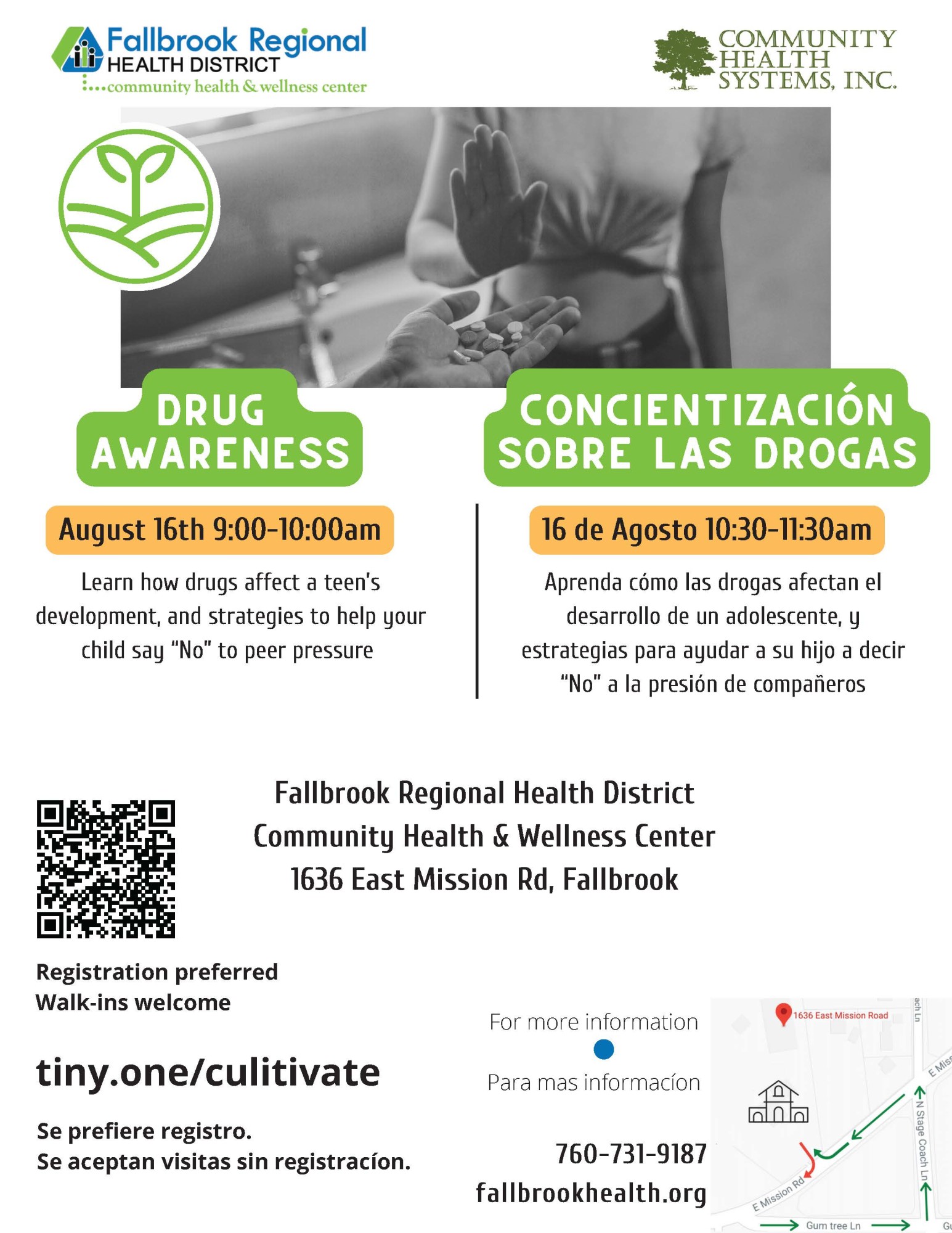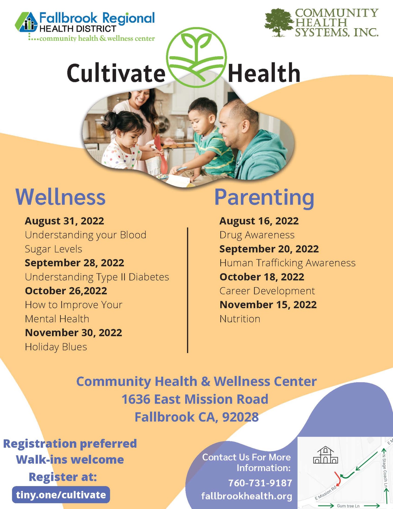 Cultivate Health- Parenting Class: Drug Awareness Back to Search Cultivate Health- Parenting Class: Drug Awareness Tuesday, August 16, 2022 (9:00 AM - 10:00 AM) (PDT) Description Additional Info × Community Health & Wellness Center 1636 E. Mission Rd. Fallbrook, CA 92028 United States Tuesday, August 16, 2022 (9:00 AM - 10:00 AM) (PDT) Registered Guests × Share × Print Email Add to Calendar Facebook LinkedIn X Pinterest Powered By GrowthZone