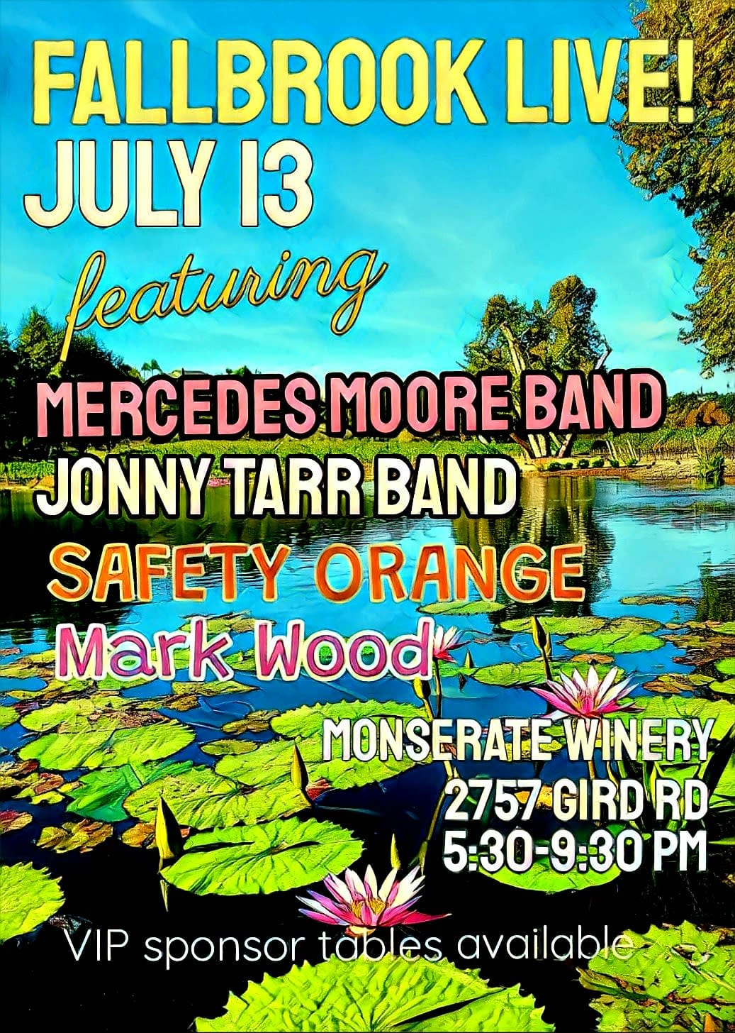 We are incredibly excited for the season debut of this long standing event (our 8th season) in Fallbrook. Once again, we'll be back at the Monserate Winery and really appreciate their committment to original live music in our community. Please note, this is a MUSIC FOR THE PEOPLE event (this means it's FREE for all to attend.) This is possible due to the generosity of our VIP sponsors (the VIP table purchasers) who help underwrite this event. We feel strongly that EVERYONE should have access to high quality live music and are very proud of our partnership with the Monserate Winery. Our incredibly diverse lineup of performers on July 13th includes the Mercedes Moore Band (blues & soul), Safety Orange (reggae/pop), The Jonny Tarr Band (San Diego Pop Performer of the Year), along with the legendary Mark Wood (an Orange County icon.) Please note, we offer our VIP sponsors premium tables at the event. Others can bring beach chairs with some limited seating provided by the winery. A table of 4 is just ($85), table of 6 ($125), table of 8 is ($170). Again, please note, this is how we pay all the musicians and production costs. We also offer VIP sponsor reserved seats near the stage. We appreciate your support! Great food will also be available at the winery. No kids under 21 and no pets are allowed.