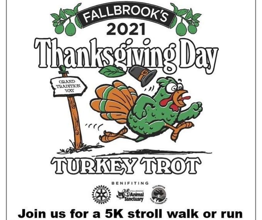 2021 Annual Fallbrook Thanksgiving Day Turkey Trot is a fun family Thanksgiving morning to come together with the community to raise money for the Fallbrook Village Rotary Club Foundation while feeling good and creating memories of a lifetime. Our goal is to raise funds for the Fallbrook Land Conservancy, Fallbrook Animal Sanctuary and the Fallbrook Community(s).