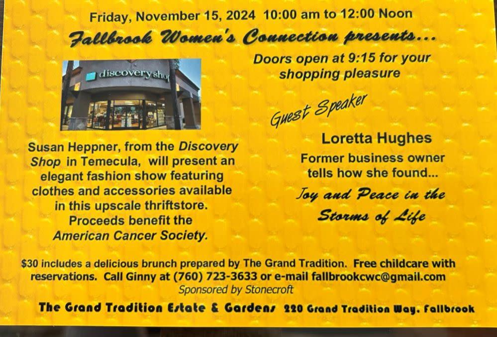 Susan Heppner from the Discovery Shop in Temecula to put on an elegant fashion show. There will be 9 ladies modeling two outfits each. She will also have shopping before and after the event. All proceeds benefit the American Cancer Society.