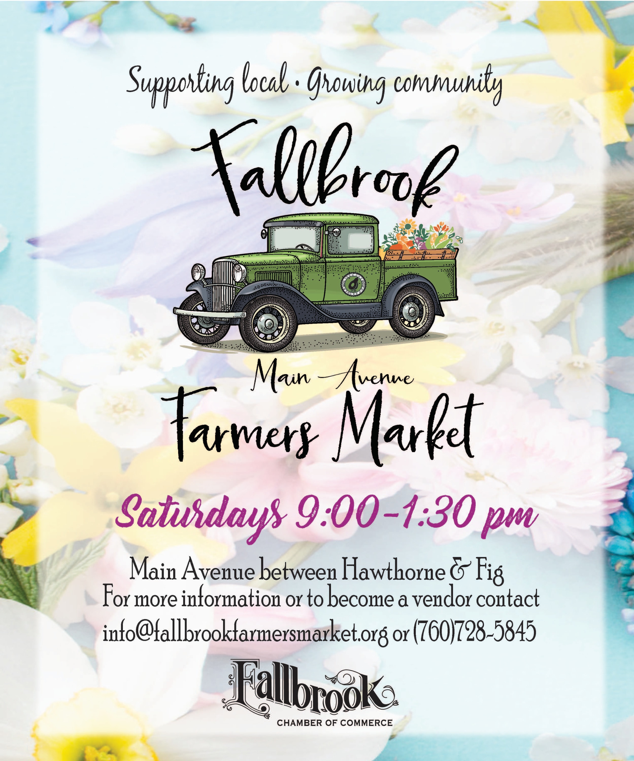 Farmers Market Downtown on Main Ave. Back to Search Farmers Market Downtown on Main Ave. Saturday, March 23, 2024 (9:00 AM - 1:30 PM) (PDT) Description Vendor ApplicationVendor Application Continued Additional Info × Main Ave, Downtown Fallbrook Fallbroook, CA 92028 United States Saturday, March 23, 2024 (9:00 AM - 1:30 PM) (PDT) Registered Guests × Share × Print Email Add to Calendar Facebook LinkedIn X Pinterest Powered By GrowthZone