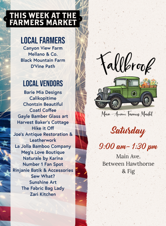 Farmers Market Downtown on Main Ave. Back to Search Farmers Market Downtown on Main Ave. Saturday, July 2, 2022 (9:00 AM - 1:30 PM) (PDT) Description Vendor ApplicationVendor Application Continued Additional Info × Main Ave, Downtown Fallbrook Fallbroook, CA 92028 United States Saturday, July 2, 2022 (9:00 AM - 1:30 PM) (PDT) Registered Guests × Share × Print Email Add to Calendar Facebook LinkedIn X Pinterest Powered By GrowthZone