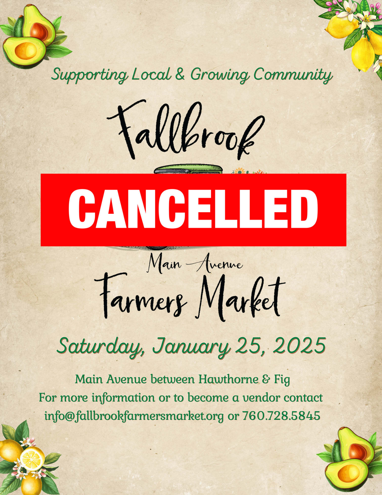 Farmers Market Downtown on Main Ave. - CANCELLED Back to Search Farmers Market Downtown on Main Ave. - CANCELLED Saturday, January 25, 2025 (9:00 AM - 1:30 PM) (PST) Description Vendor ApplicationVendor Application Continued Additional Info × Main Ave, Downtown Fallbrook Fallbroook, CA 92028 United States Saturday, January 25, 2025 (9:00 AM - 1:30 PM) (PST) Registered Guests × Share × Print Email Add to Calendar Facebook LinkedIn X Pinterest Powered By GrowthZone