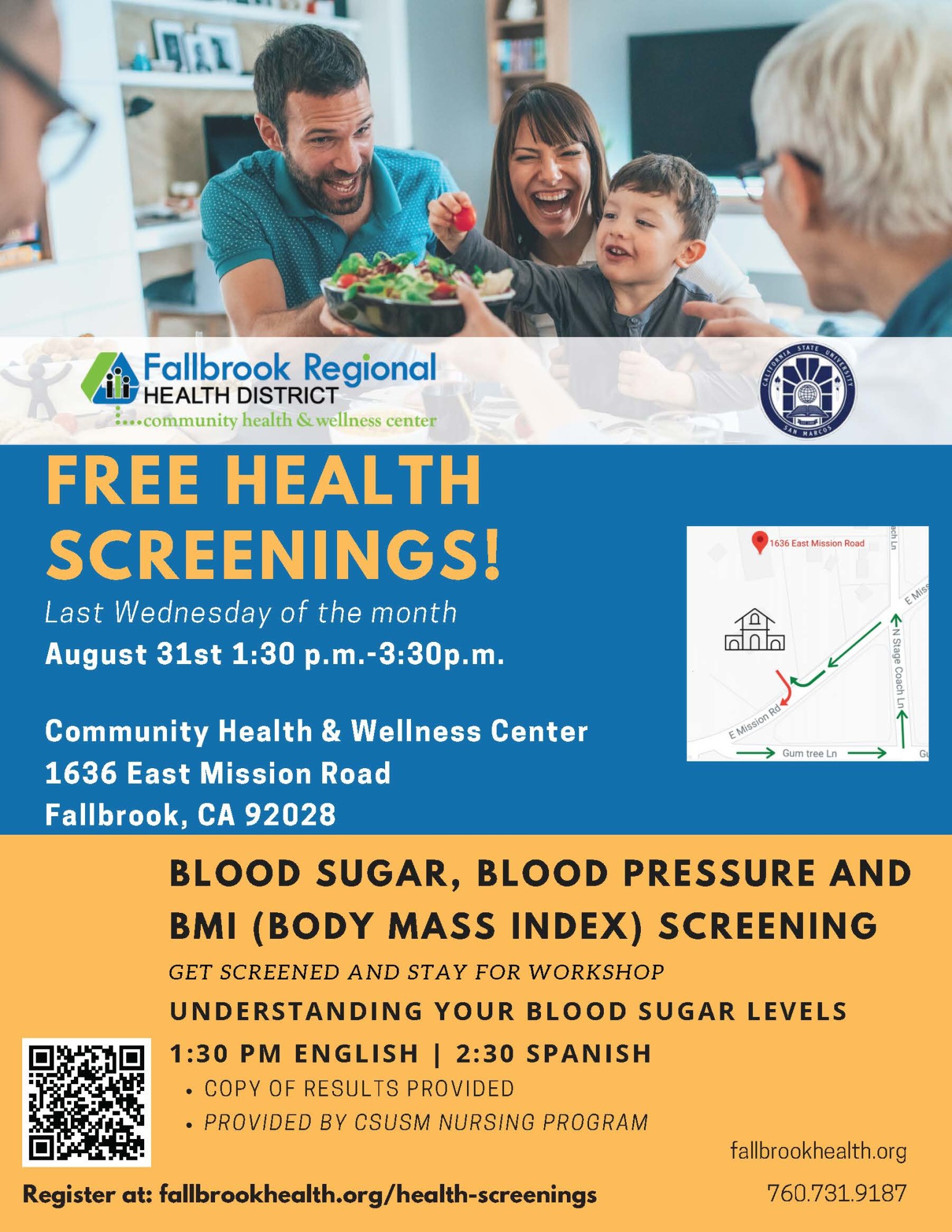 Free Health Screening Back to Search Free Health Screening Wednesday, August 31, 2022 (1:30 PM - 3:30 PM) (PDT) Description Additional Info × Community Health & Wellness Center 1636 E. Mission Rd. Fallbrook, CA 92028 United States Wednesday, August 31, 2022 (1:30 PM - 3:30 PM) (PDT) Registered Guests × Share × Print Email Add to Calendar Facebook LinkedIn X Pinterest Powered By GrowthZone