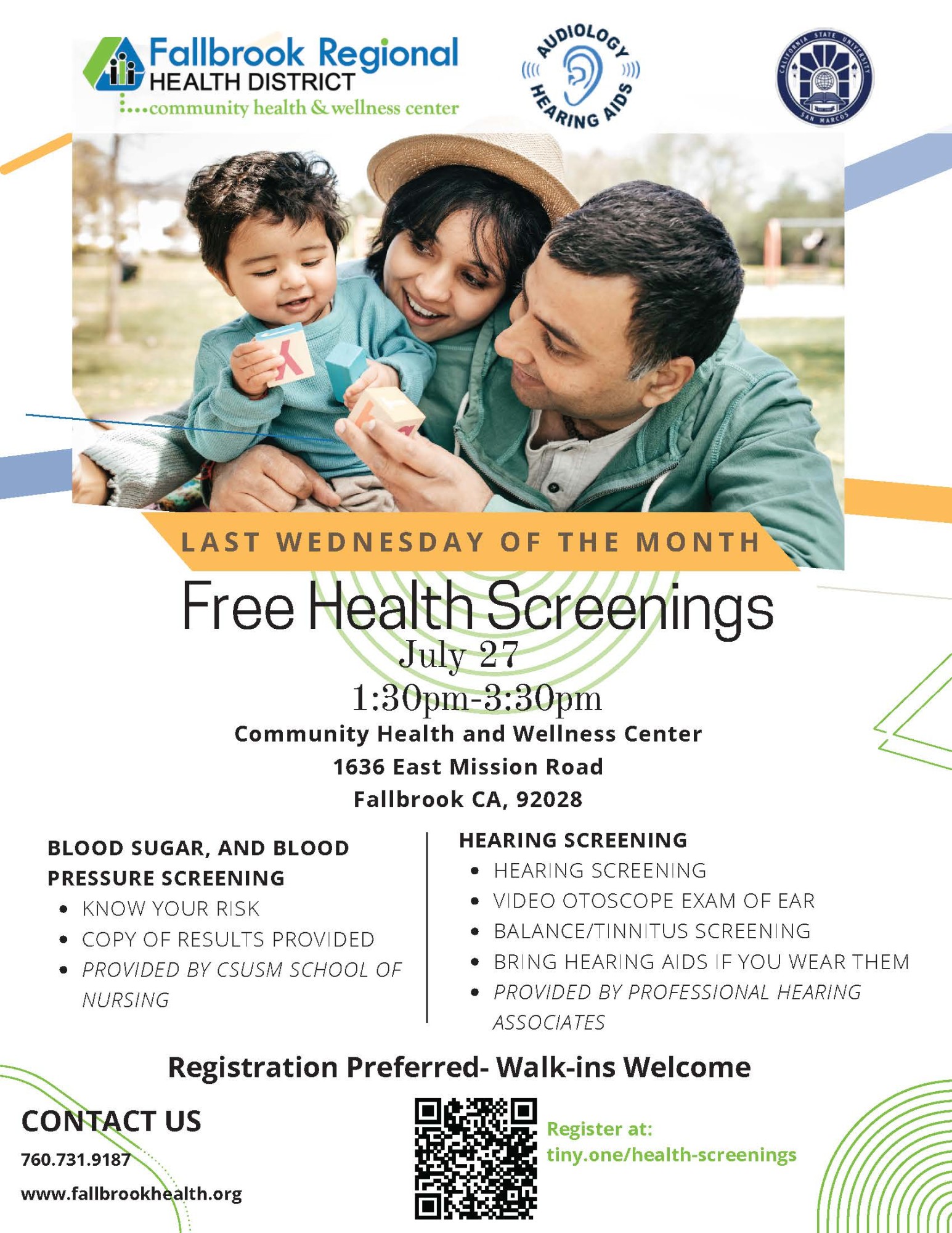 July 27 | 1:30 p - 3:30 p Hearing, diabetes and blood pressure screenings are offered on the last Wednesday of the month. Hearing screening provided by Professional Hearing Associates. If no appointments are available for hearing screening, please join the wait list and we will contact you as appointments come available.