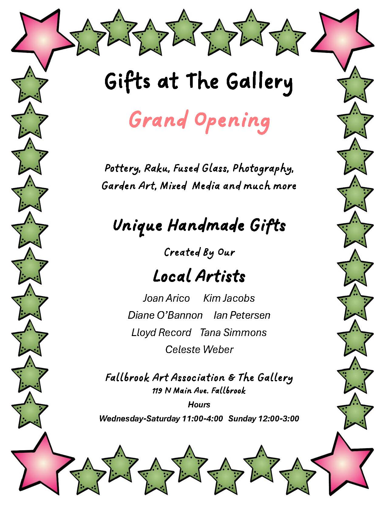 Gifts at the Gallery - Grand Opening Back to Search Gifts at the Gallery - Grand Opening Saturday, November 2, 2024 11:00 AM - Saturday, November 30, 2024 11:00 AM (PDT) Description Runs from 11/2/2024 - 11/20/2024 Additional Info × Fallbrook Artists Association - The Gallery 119 N. Main Ave. Fallbrook, CA 92028 United States Saturday, November 2, 2024 11:00 AM - Saturday, November 30, 2024 11:00 AM (PDT) Registered Guests × Share × Print Email Add to Calendar Facebook LinkedIn X Pinterest Powered By GrowthZone