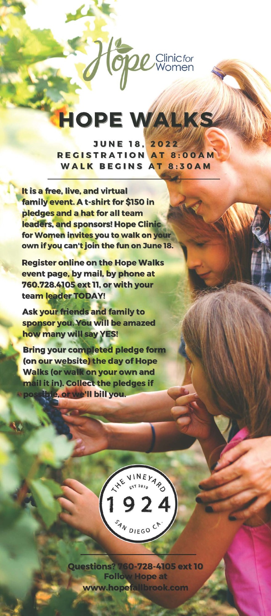 Hope Walks scheduled for June 18, is a yearly event in early summer hosted at The Vineyard 1924 in Fallbrook CA that allows those who support the work of Hope Clinic for Women to walk in support for the moms in our programs and the lives of babies born and unborn in our community!