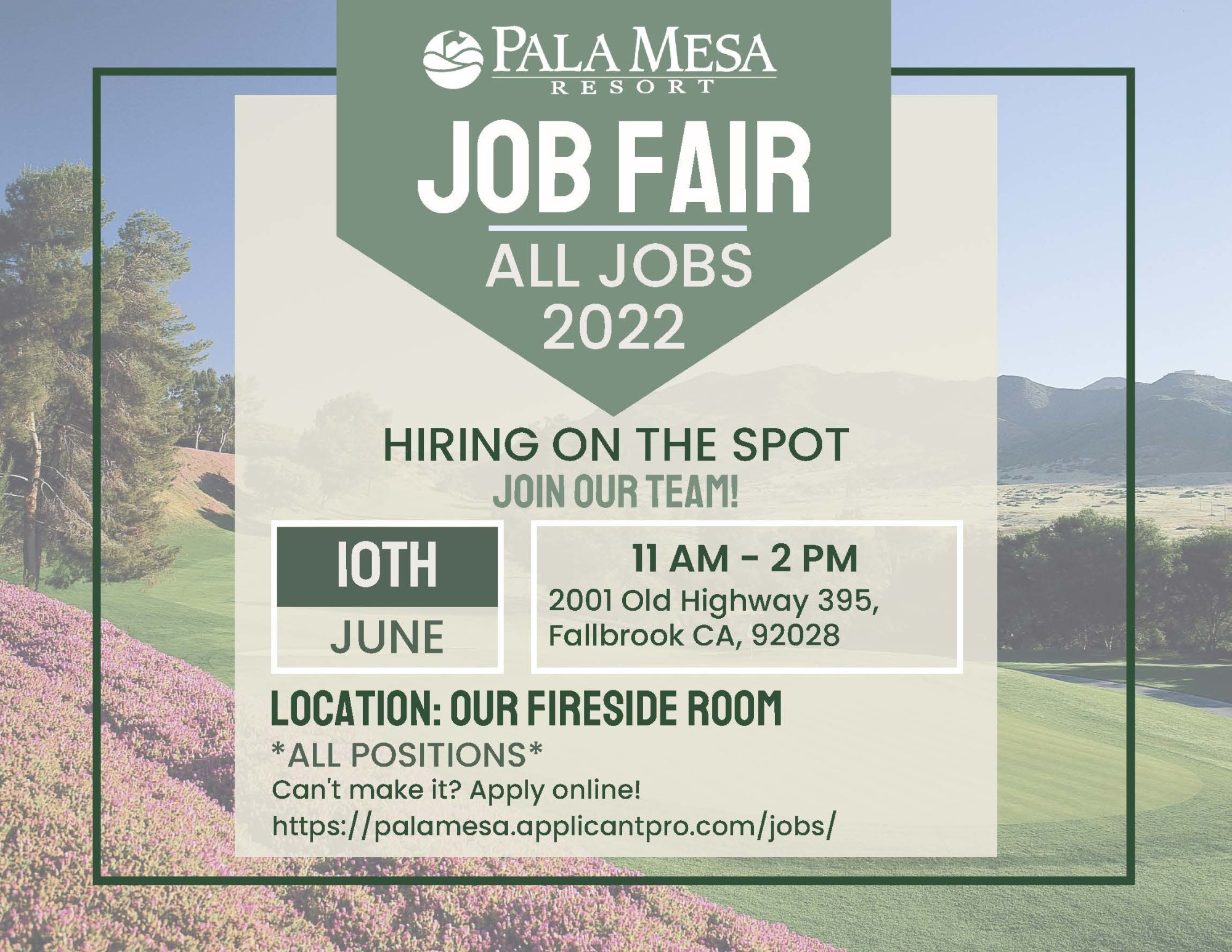 Job Fair at Pala Mesa Resort Back to Search Job Fair at Pala Mesa Resort Friday, June 10, 2022 (11:00 AM - 2:00 PM) (PDT) Description Additional Info × Pala Mesa Resort 2001 Old Highway 395 Fallbrook, CA 92028 United States Friday, June 10, 2022 (11:00 AM - 2:00 PM) (PDT) Registered Guests × Share × Print Email Add to Calendar Facebook LinkedIn X Pinterest Powered By GrowthZone