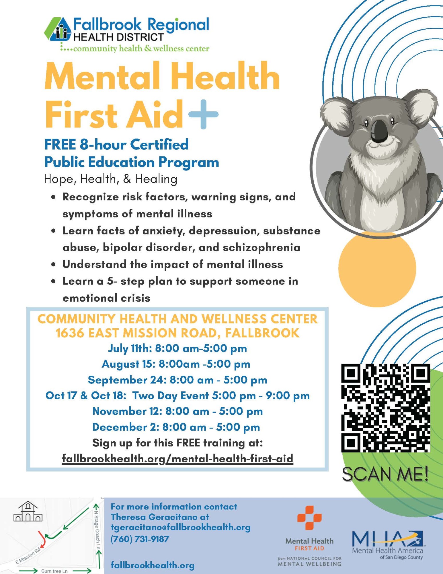 Mental Health First Aid Back to Search Mental Health First Aid Saturday, September 24, 2022 (8:00 AM - 5:00 PM) (PDT) Description July 11 | 8 a - 5 p Adult Mental HealthAug 15 | 8 a - 5 p Adult Mental HealthSept 24 | 8 a - 5 p Adult Mental Health Additional Info × Community Health & Wellness Center 1636 E. Mission Rd. Fallbrook, CA 92028 United States Saturday, September 24, 2022 (8:00 AM - 5:00 PM) (PDT) Registered Guests × Share × Print Email Add to Calendar Facebook LinkedIn X Pinterest Powered By GrowthZone