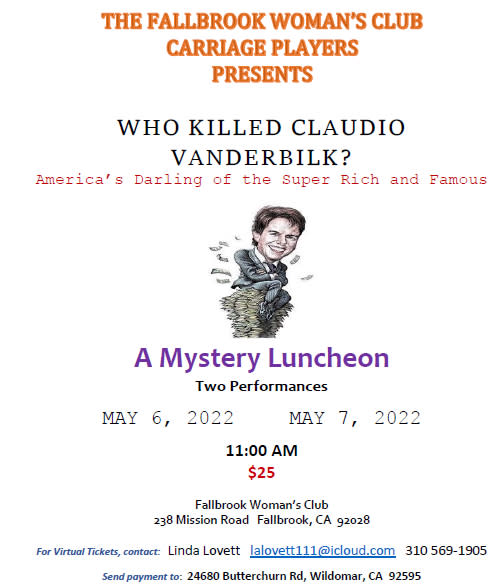 Murder Mystery Luncheon- Who Killed Claudio Vanderbilk Back to Search Murder Mystery Luncheon- Who Killed Claudio Vanderbilk Friday, May 6, 2022 (11:00 AM - 1:00 PM) (PDT) Description Additional Info × Fallbrook Woman's Club 238 W. Mission Rd. Fallbrook, CA 92028 United States Friday, May 6, 2022 (11:00 AM - 1:00 PM) (PDT) Registered Guests × Share × Print Email Add to Calendar Facebook LinkedIn X Pinterest Powered By GrowthZone