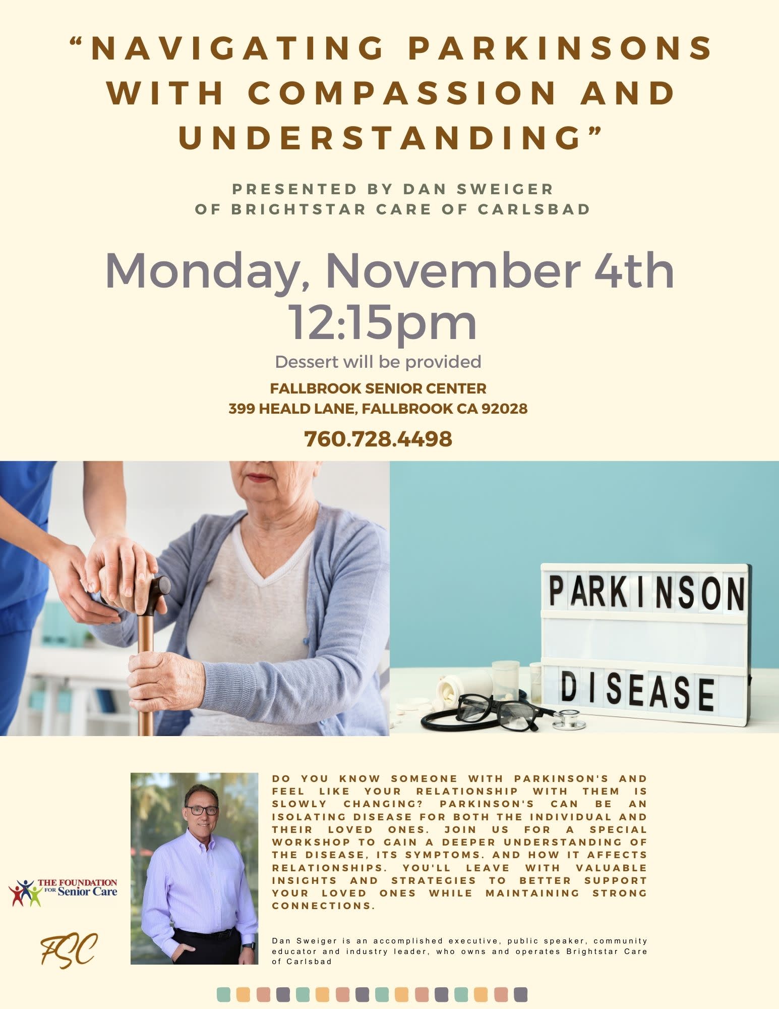 Navigating Parkinsons with Compassion and Understanding - Presented by Dan Sweiger Back to Search Navigating Parkinsons with Compassion and Understanding - Presented by Dan Sweiger Monday, November 4, 2024 (12:15 PM - 2:00 PM) (PST) Description Additional Info × Fallbrook Senior Center 399 Heald Lane Fallbrook, 92028 United States Monday, November 4, 2024 (12:15 PM - 2:00 PM) (PST) Registered Guests × Share × Print Email Add to Calendar Facebook LinkedIn X Pinterest Powered By GrowthZone