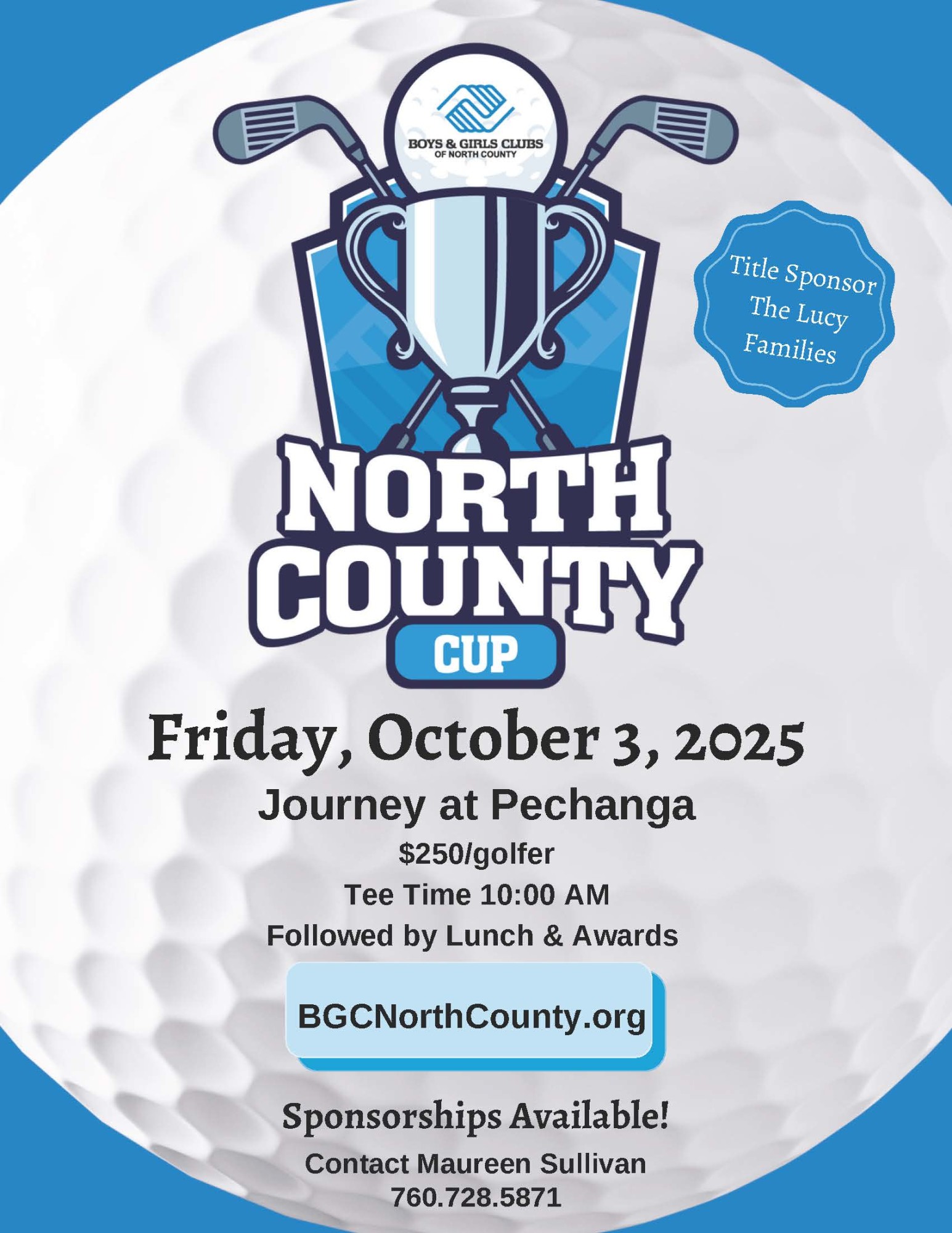 The Boys & Girls Clubs of North County will host the annual North County Cup at Journey at Pechanga on Friday, October 3, 2025. Golfers of all skill levels are welcome to participate, and all proceeds will benefit the Boys & Girls Clubs of North County. Tickets are priced at $250 per golfer, and sponsorship opportunities are available. For more information, please visit www.bgcnorthcounty.org or call 760.728.5871.