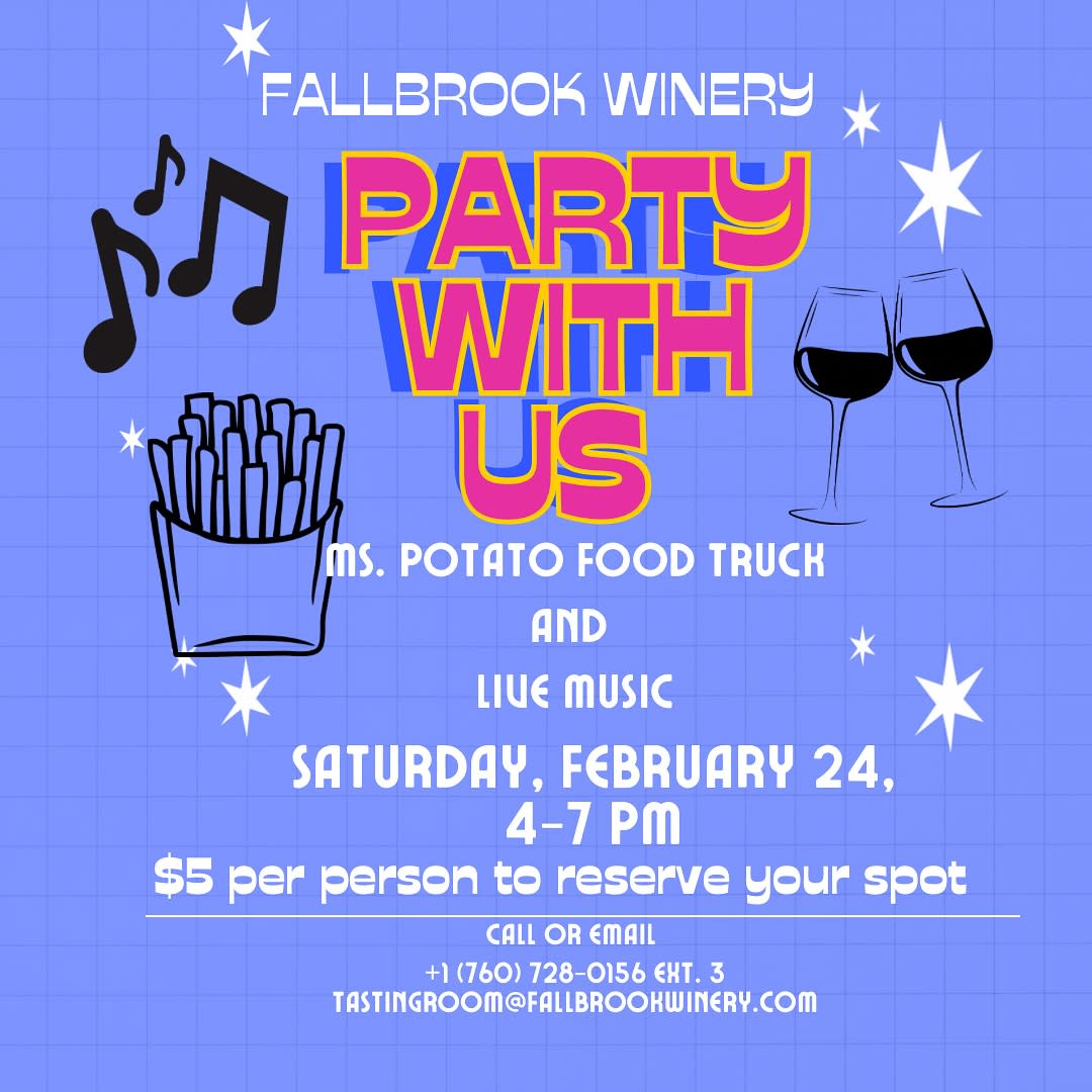 Join us for our first party of the year here at Fallbrook Winery! On Saturday, February 24 we will have live music & the amazing Ms. Potato food truck! Spaces are limited- so please call or email to reserve your spot ahead of time. This event is open to both members and nonmembers! Also, for our evening we will be serving wine by the glass or bottle only. We look forward to having you!