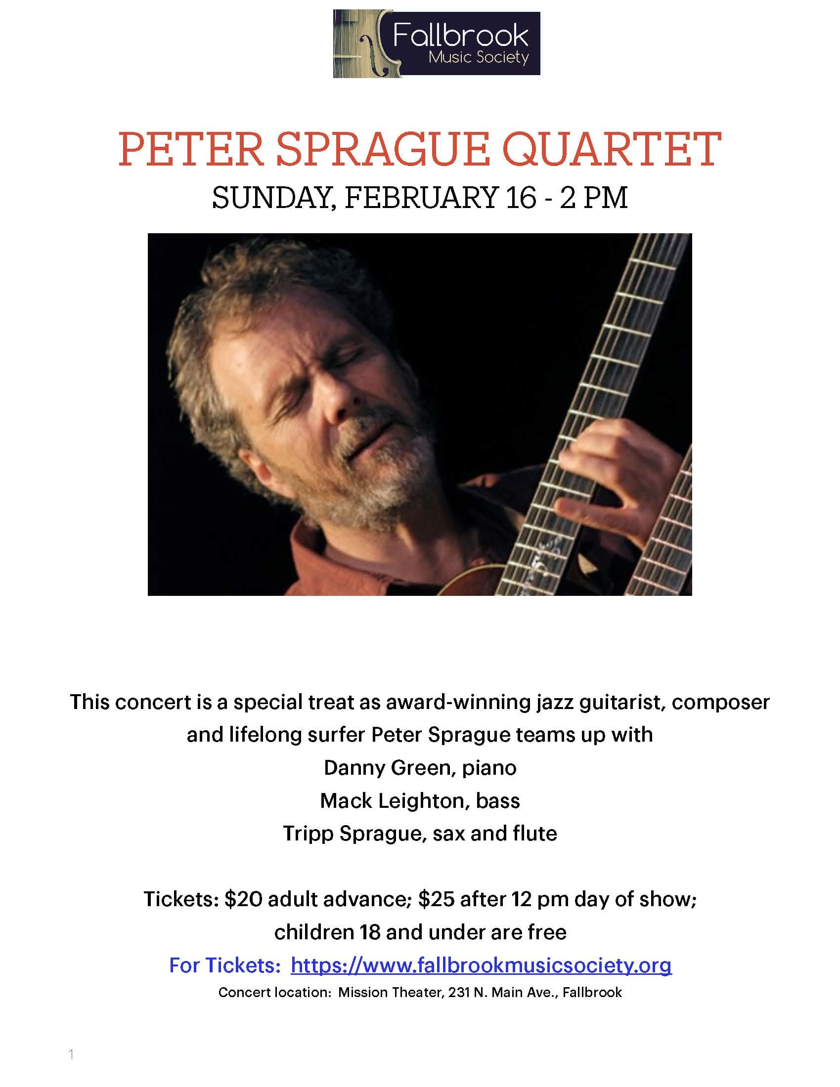 We're in for a special afternoon as award-winning jazz guitarist, composer and life-long surfer Peter Sprague teams up with pianist Danny Green, bassist Mack Leighton and Tripp Sprague, sax and flute. Together they will bring us music that jumps! It jumps around jazz, samba, The Beatles, tango, Hoagy Carmichael, John Coltrane and probably even a few compositions by Peter.