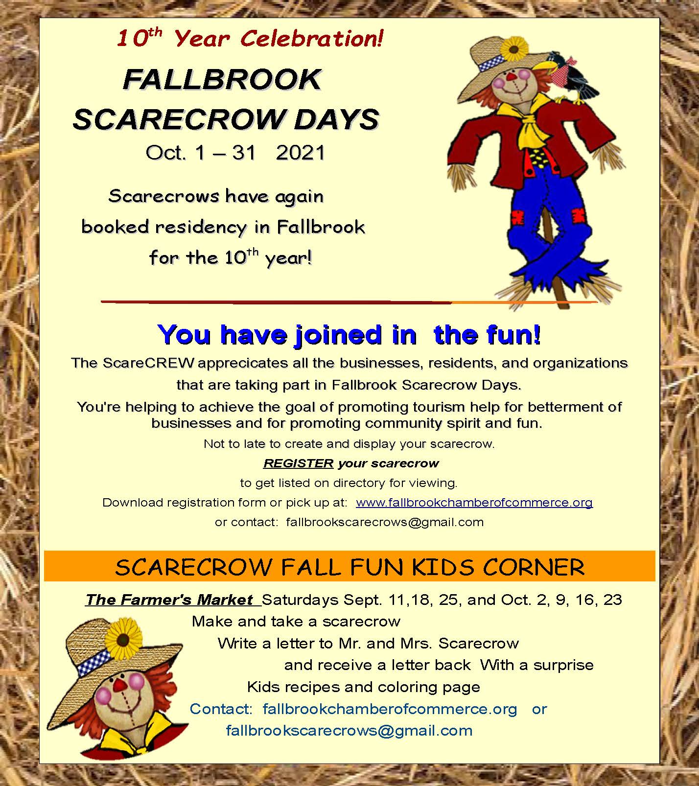 Scarecrow Days Back to Search Scarecrow Days Friday, October 1, 2021 9:00 AM - Sunday, October 31, 2021 12:00 PM (PDT) Description CLICK SCARECROW TO DOWNLOAD LOCATION LIST Additional Info × Address Fallbrook, CA 92028 United States Friday, October 1, 2021 9:00 AM - Sunday, October 31, 2021 12:00 PM (PDT) Registered Guests × Share × Print Email Add to Calendar Facebook LinkedIn X Pinterest Powered By GrowthZone