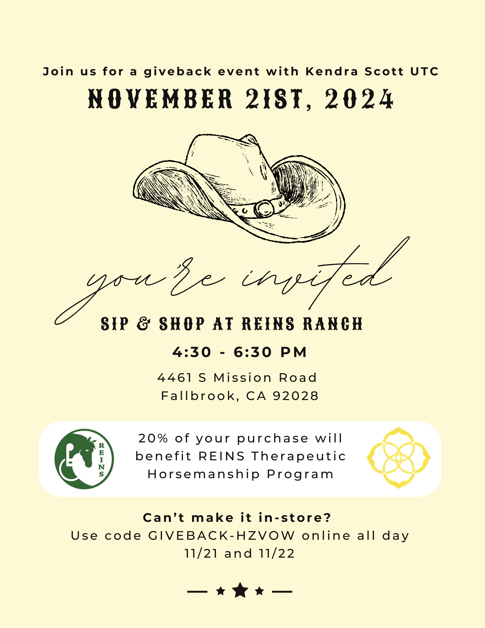 Sip & Shop at REINS Ranch Back to Search Sip & Shop at REINS Ranch Thursday, November 21, 2024 (4:30 PM - 6:30 PM) (PST) Description Additional Info × REINS 4461 S. Mission Rd. Fallbrook, CA 92028 United States Thursday, November 21, 2024 (4:30 PM - 6:30 PM) (PST) Registered Guests × Share × Print Email Add to Calendar Facebook LinkedIn X Pinterest Powered By GrowthZone