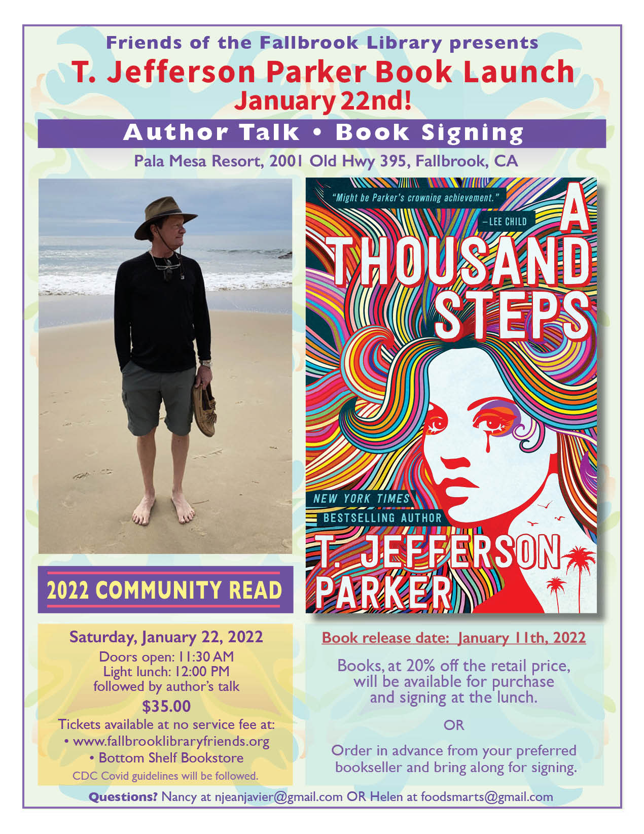 T. Jefferson Parker Book Launch- Presented by Friends of the Fallbrook Library Back to Search T. Jefferson Parker Book Launch- Presented by Friends of the Fallbrook Library Saturday, January 22, 2022 (11:30 AM - 12:00 PM) (PST) Description Author Talk- Book SigningTickets available $35 online and at the Bottom Shelf Bookstore Additional Info × Pala Mesa Resort 2001 S. Highway 395 Fallbrook, CA 92028 United States Saturday, January 22, 2022 (11:30 AM - 12:00 PM) (PST) Registered Guests × Share × Print Email Add to Calendar Facebook LinkedIn X Pinterest Powered By GrowthZone