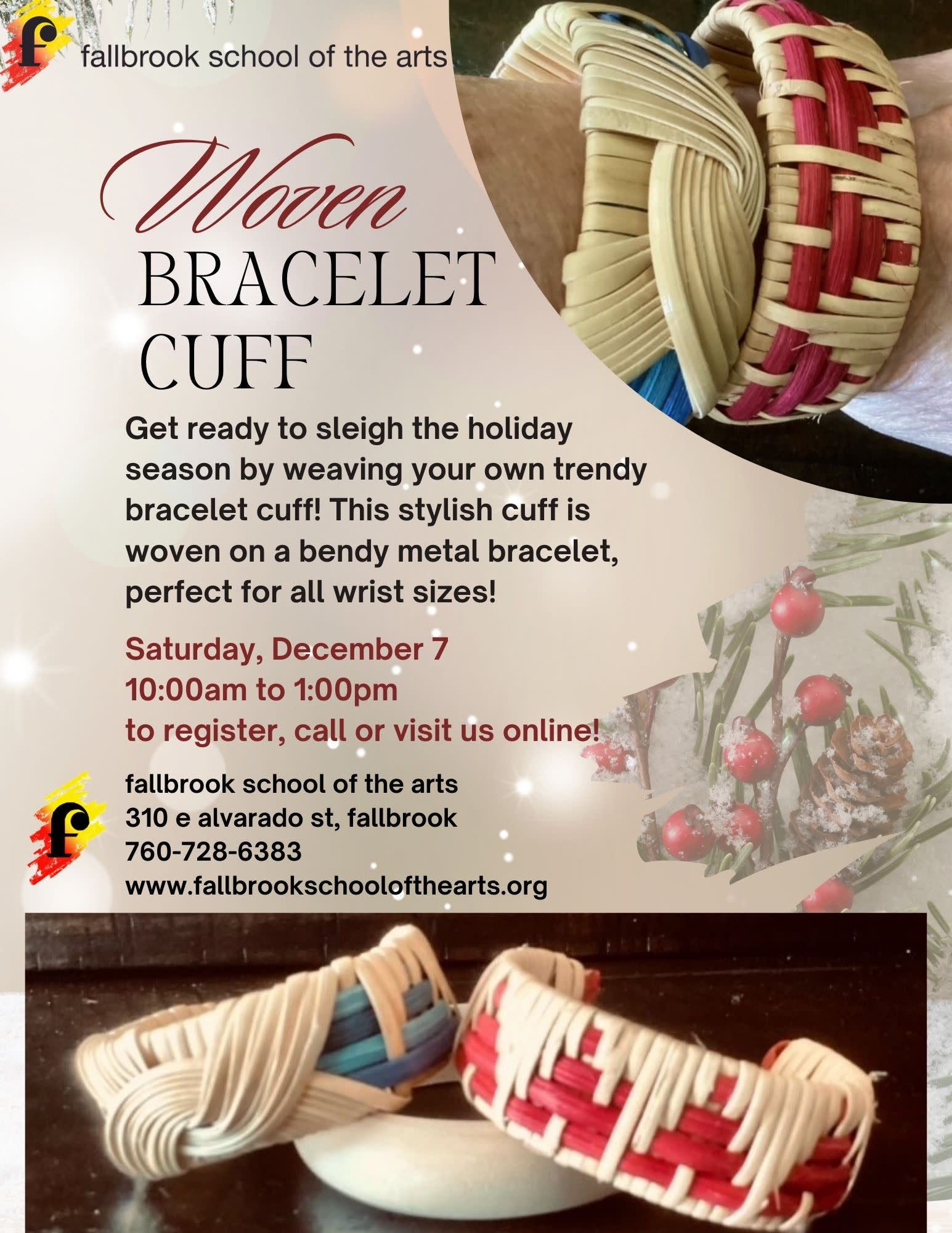 Get ready to sleigh the holiday season by weaving your own trendy bracelet cuff! This stylish cuff is woven on a bendy metal bracelet, perfect for all wrist sizes! Get creative with a mix of colorful dyed reeds to jazz up your cuff. Pick a cool pattern or let your creativity soar with a custom design. With a rainbow of reed hues to choose from, you'll have a beautiful accessory that will complement any outfit!