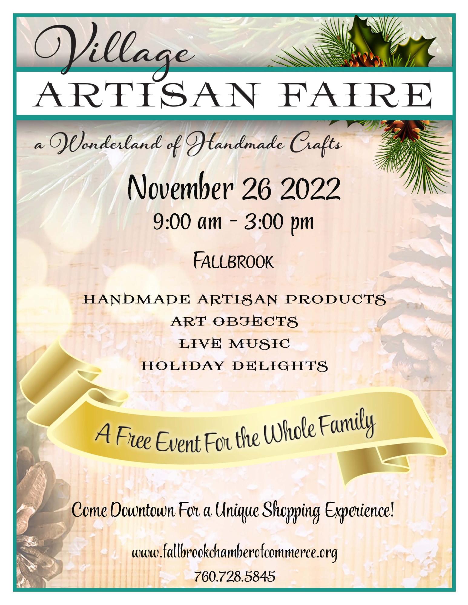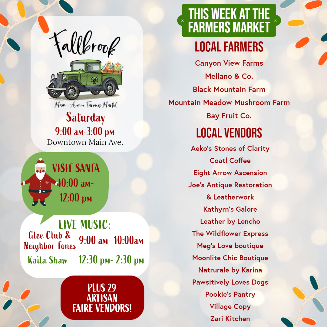 Farmers Market Downtown on Main Ave. [ During the Village Artisan Faire] Back to Search Farmers Market Downtown on Main Ave. [ During the Village Artisan Faire] Saturday, November 26, 2022 (9:00 AM - 3:00 PM) (PST) Description Farmers Market in conjunction with the Village Artisan Faire!Vendor ApplicationVendor Application Continued Additional Info × Main Ave, Downtown Fallbrook Fallbroook, CA 92028 United States Saturday, November 26, 2022 (9:00 AM - 3:00 PM) (PST) Registered Guests × Share × Print Email Add to Calendar Facebook LinkedIn X Pinterest Powered By GrowthZone
