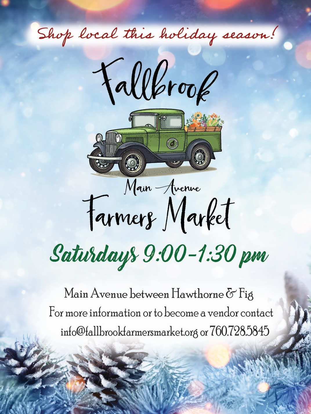 Farmers Market Downtown on Main Ave. [ During the Village Artisan Faire] Back to Search Farmers Market Downtown on Main Ave. [ During the Village Artisan Faire] Saturday, November 26, 2022 (9:00 AM - 3:00 PM) (PST) Description Farmers Market in conjunction with the Village Artisan Faire!Vendor ApplicationVendor Application Continued Additional Info × Main Ave, Downtown Fallbrook Fallbroook, CA 92028 United States Saturday, November 26, 2022 (9:00 AM - 3:00 PM) (PST) Registered Guests × Share × Print Email Add to Calendar Facebook LinkedIn X Pinterest Powered By GrowthZone