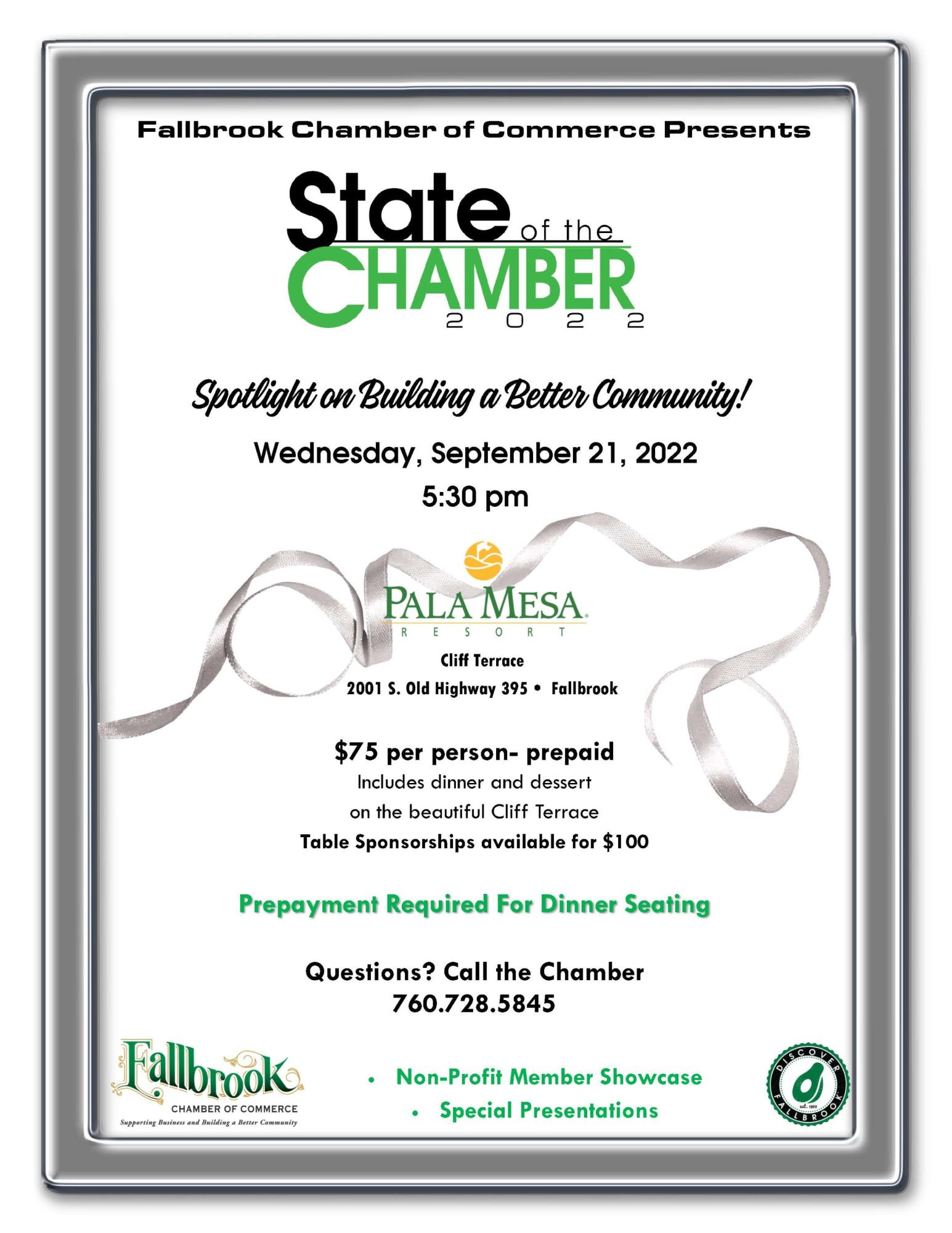 State of the Chamber 2022 Back to Search State of the Chamber 2022 Wednesday, September 21, 2022 (5:30 PM - 8:00 PM) (PDT) Description Thank You to Our Table Sponsors!Thank you to our bag sponsor!Thank you to our flower sponsor! Additional Info × Pala Mesa Resort 2001 S. Highway 395 Fallbrook, CA 92028 United States Wednesday, September 21, 2022 (5:30 PM - 8:00 PM) (PDT) Registered Guests × Share × Print Email Add to Calendar Facebook LinkedIn X Pinterest Powered By GrowthZone