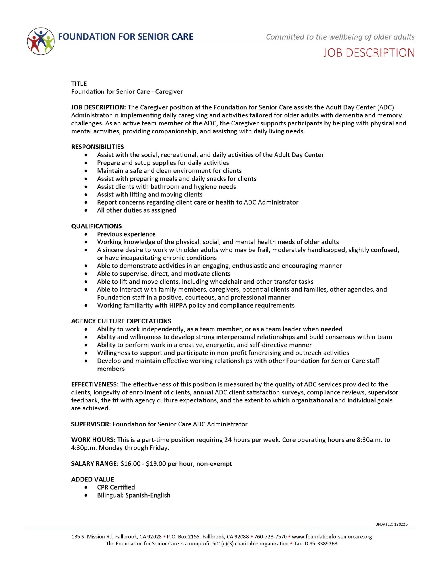 Foundation for Senior Care - Experienced Caregiver Back to Job Postings Foundation for Senior Care - Experienced Caregiver By Foundation for Senior Care 12/3/2025 Images × Additional Info Job Type : Part-Time Share × Email Facebook LinkedIn X Pinterest Powered By GrowthZone