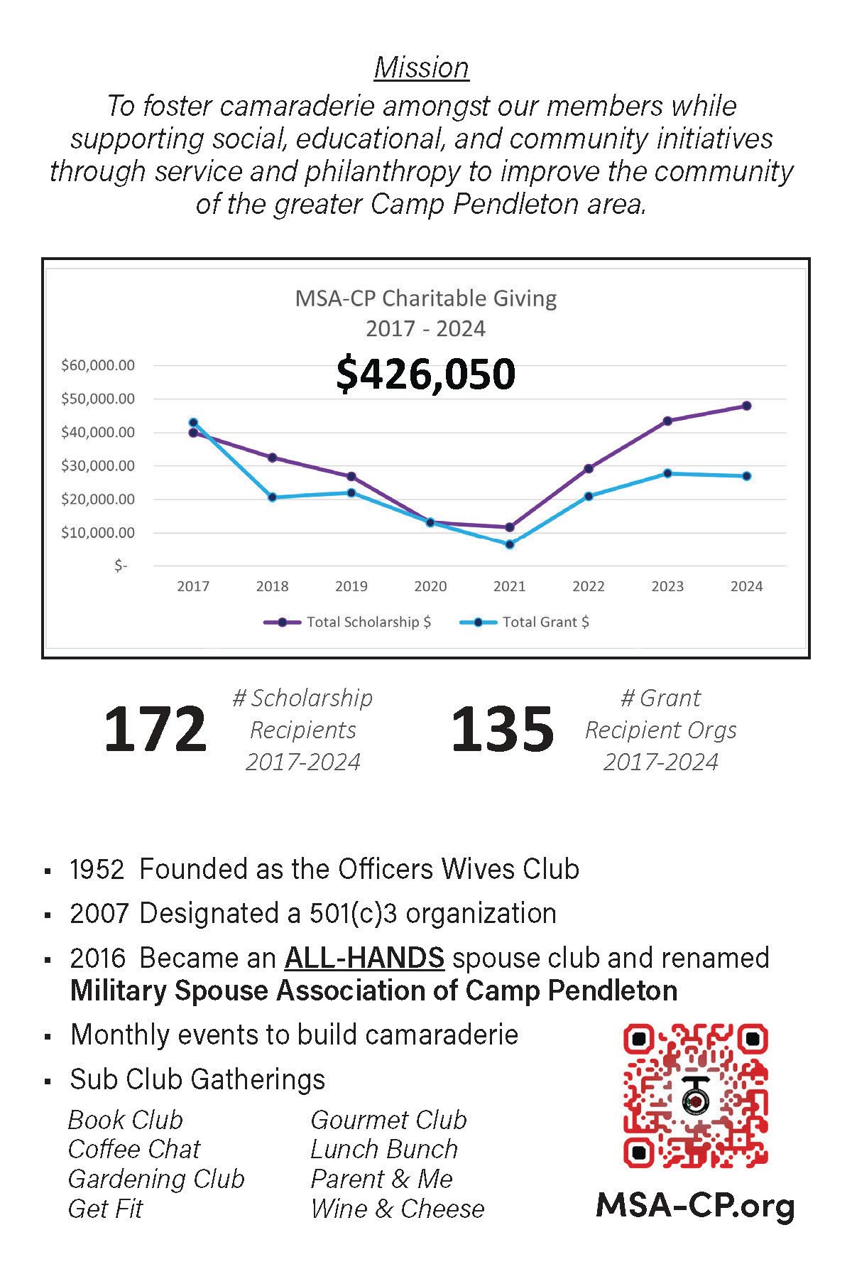 The Military Spouse Association of Camp Pendleton is a 501c3 nonprofit. Our mission is to foster camaraderie amongst our members while supporting social, educational, and community initiatives through service and philanthropy to improve the community of the greater Camp Pendleton area. MSACP commits all profits to charitable, educational, and community outreach purposes through scholarship and grants. With the help of community benefactors, MSACP volunteers are able to foster and promote positive growth of future leaders and provide support to the surrounding military community.